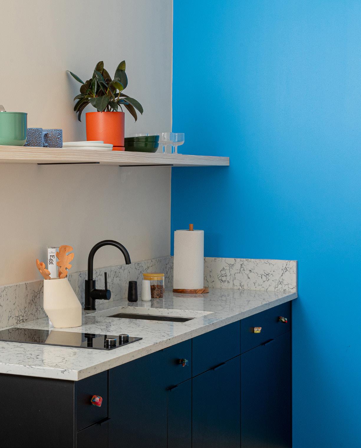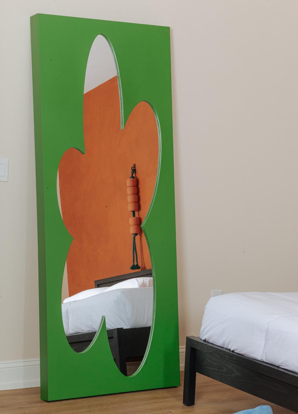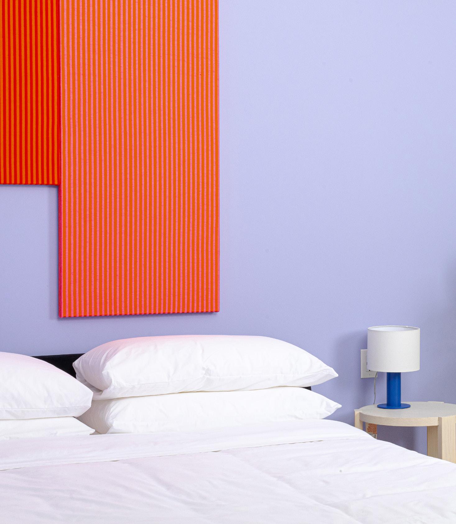“For the suite walls I wanted a warmer tone to soften the spaces angles and vivid palette. This reminded me of the color of milk after a bowl of Frosted Flakes”