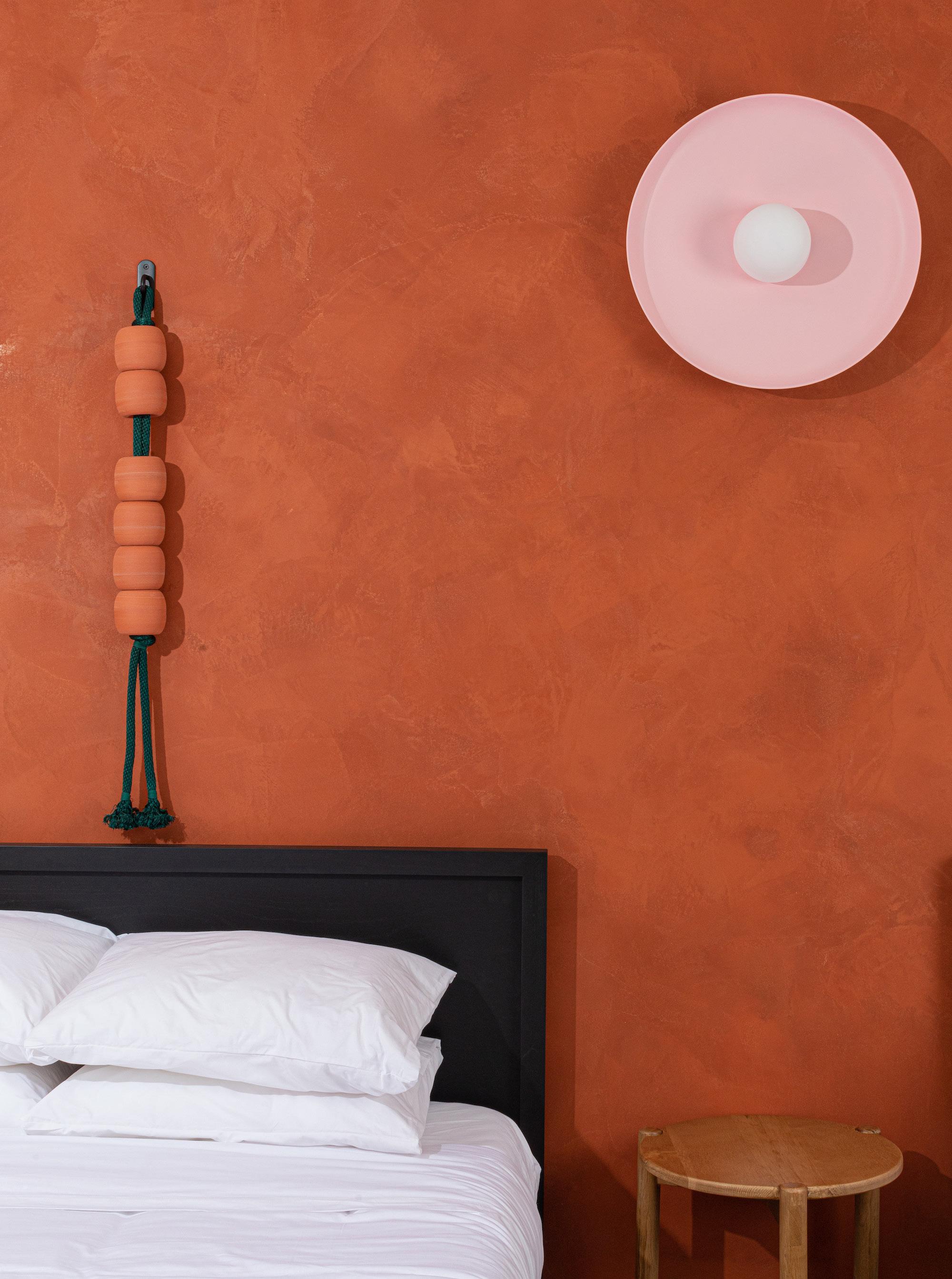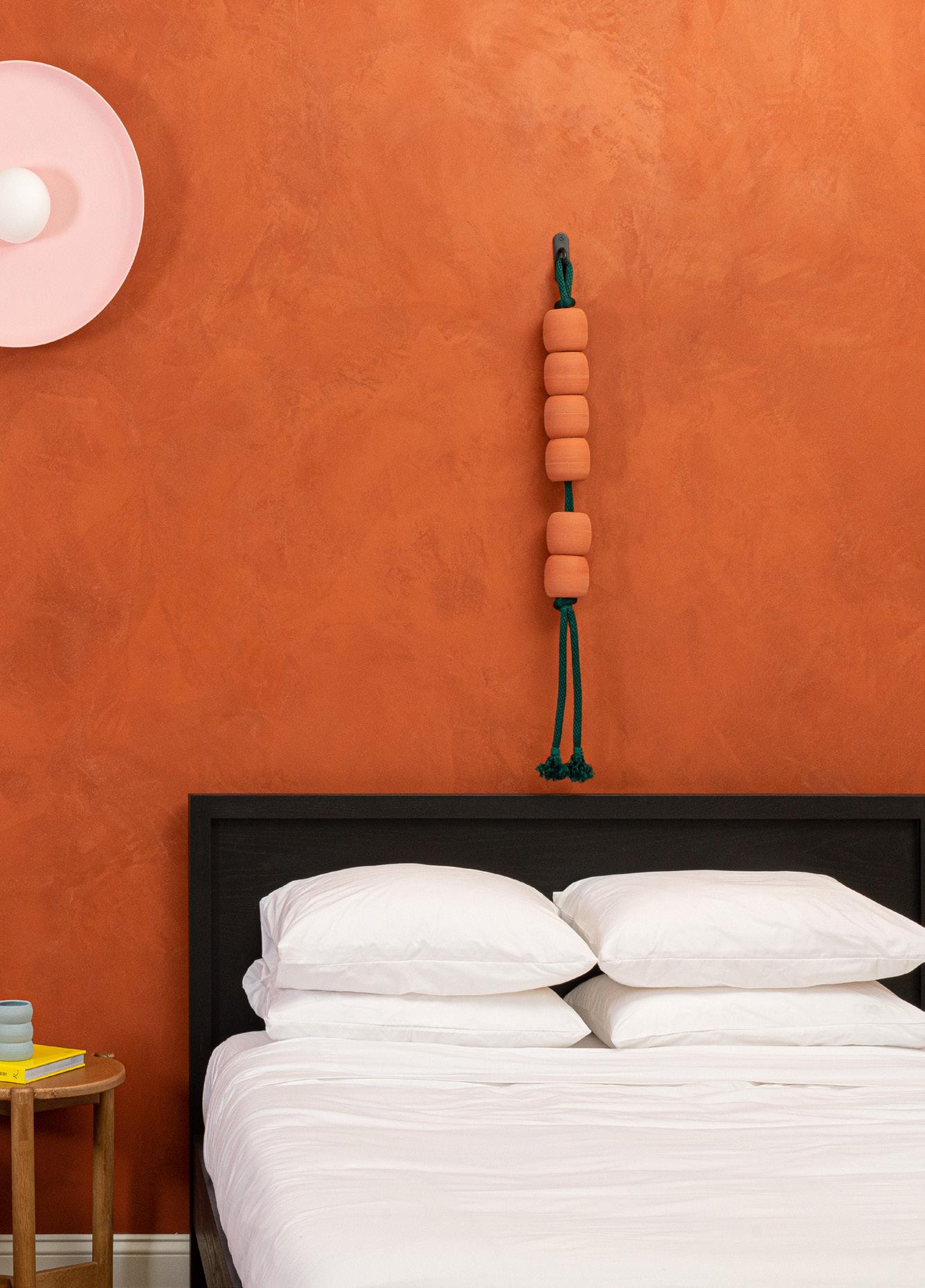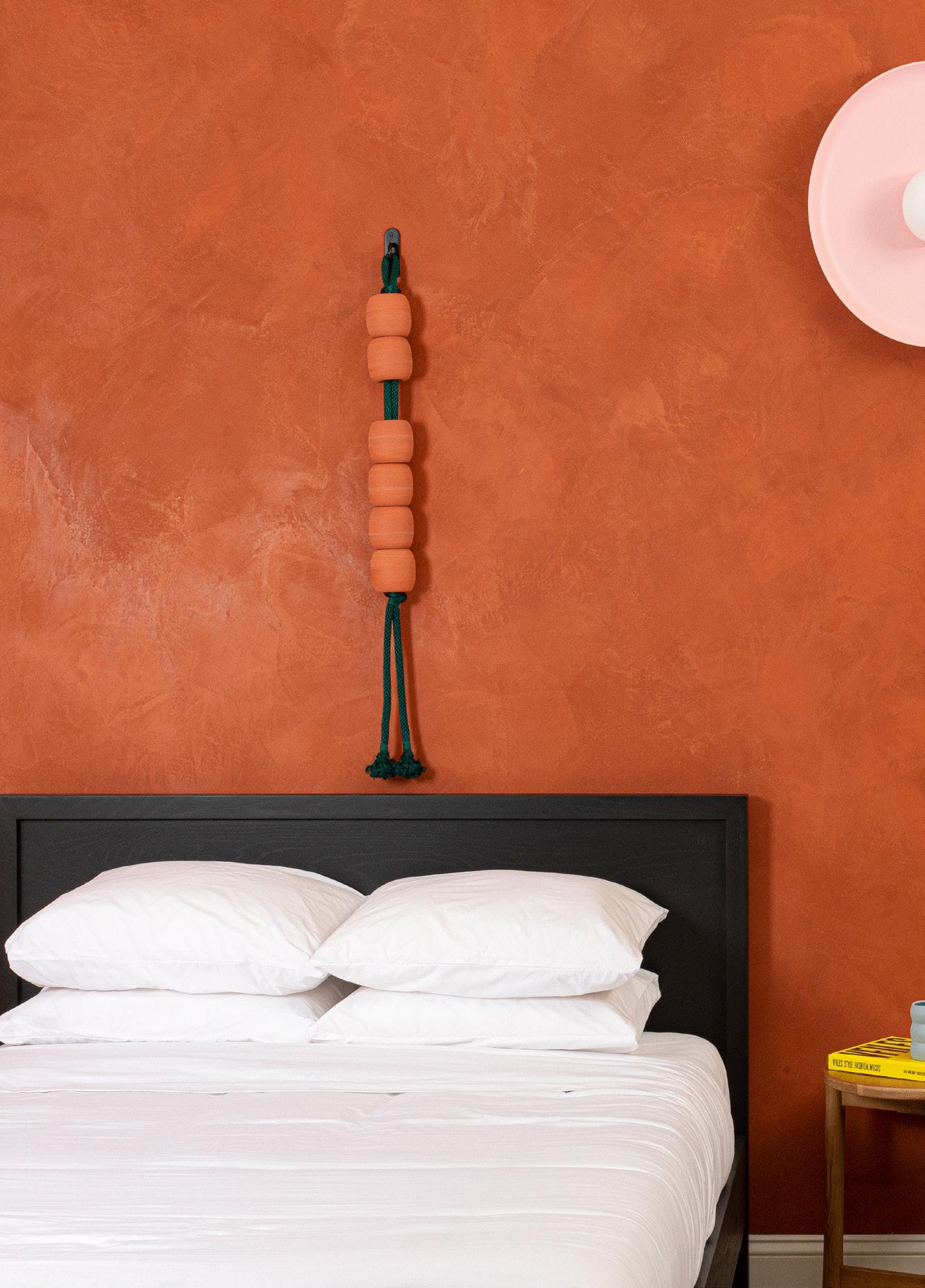 Bedroom details: Beaded artwork by Jeff Rubio, starting at $550 each, jeffrubio@gmail.com, Large hoist sconce in Chalk Pink by rbw, hello@shopyowie.com, Grove bedside table by Parachute Home, $495, parachutehome.com, Marcel bed by EQ3, from $1,399, hello@shopyowie.com, Large terracotta hued venetian plaster wall treatment by Plaster Xo, price upon request, see more helloxoxo.com. W-127 Mattress by Wright, hello@shopyowie.com