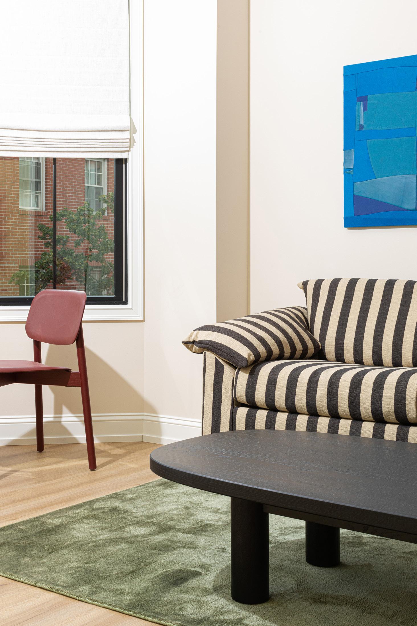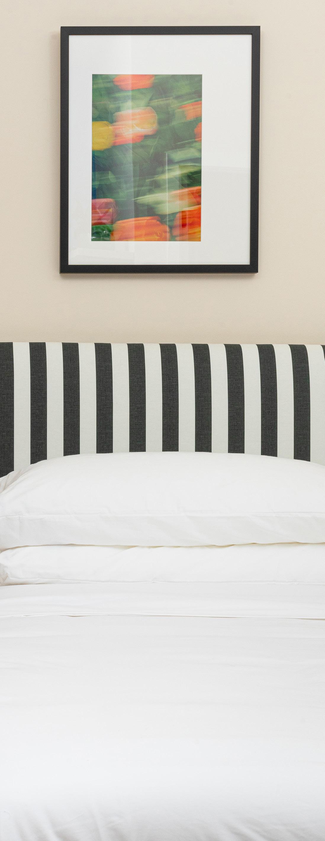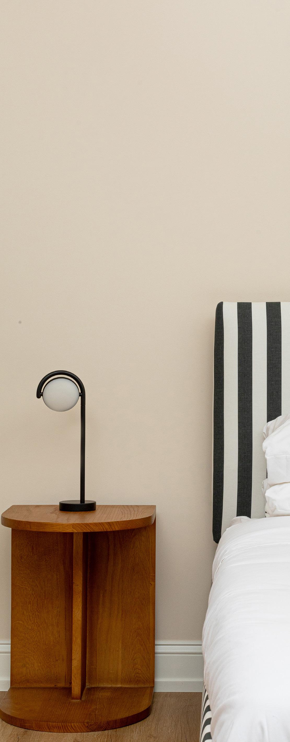 Bedroom details: Striped bed by Havenly, from $1,200, made to order at havenly.com, Framed print by Bre Furlong, from $500, see more breannefurlong.com, Bedside table, Summit table by Parachute Home, $495, parachutehome.com, Marselis table lamp by HAY, $195, available at shopyowie.com, Hart rug in natural, from $139, revivalrugs.com, W-127 mattress by Wright, hello@shopyowie.com