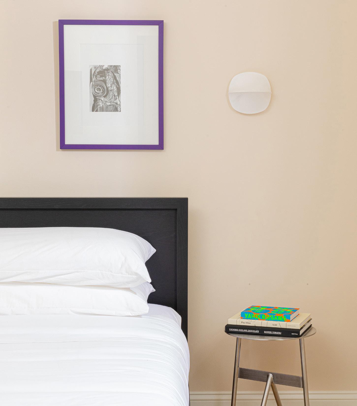 Bedroom details: Custom artwork by Alyssa Piro, See above for more info. Marcel bed by EQ3, From $1,399, hello@shopyowie.com, Matin bedside lamp (mounted but can be a table lamp too) by HAY, $195, Available at YOWIE, Bedside table by Sun at Six, $660, order at hello@shopyowie.com, Grab books at shopyowie.com