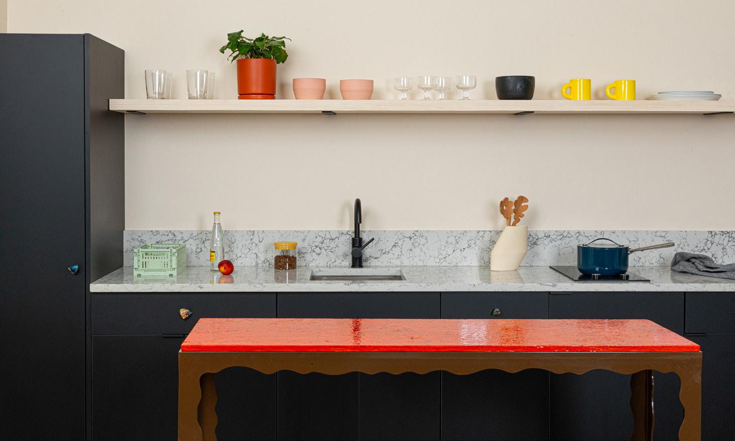 Red Kitchen Island by Carl Durkow, carldurkow.com, Pink ceramic bowls by Ekua, black bowl by Utility Objects, wine glasses by HAY, yellow mug by Hotel Ceramics, all are available at shopyowie.com and in shop downstairs!