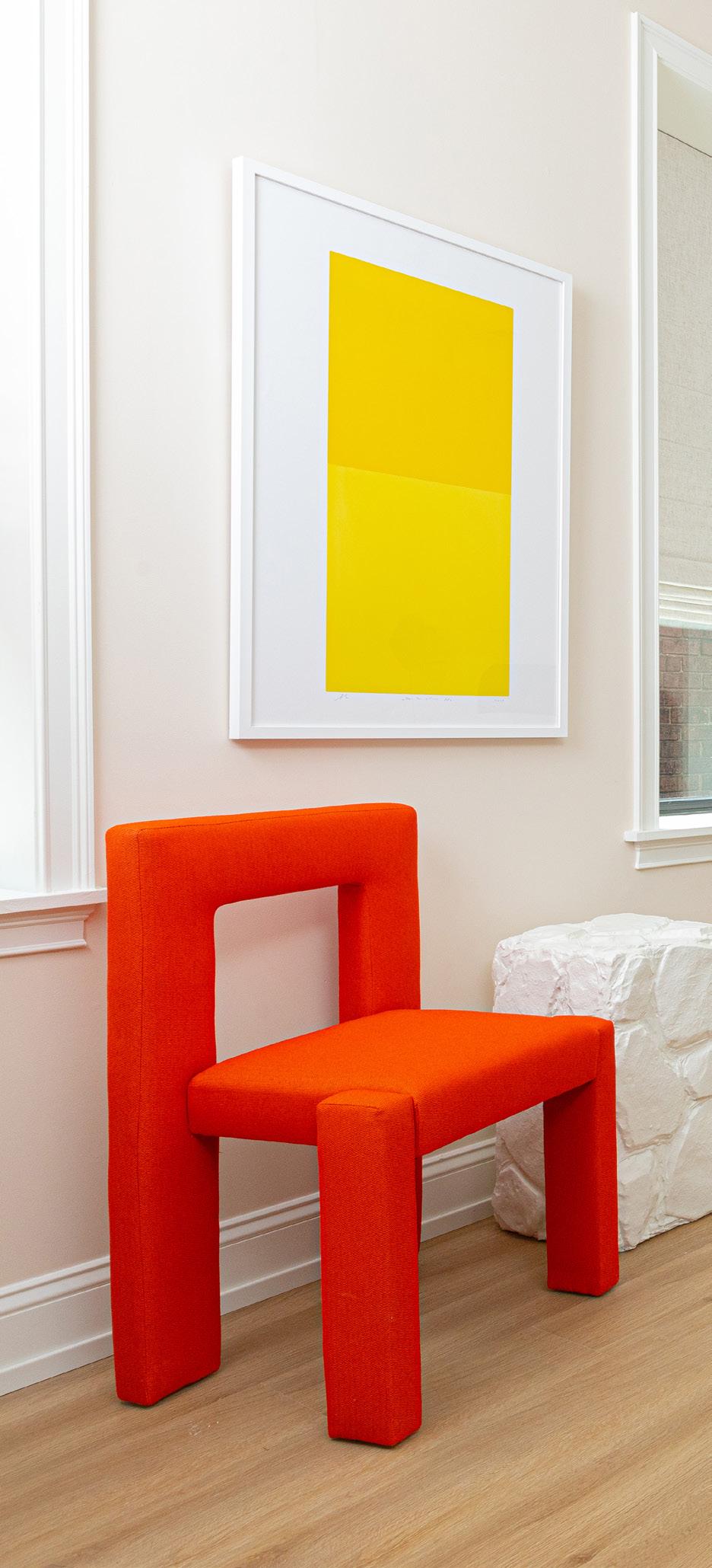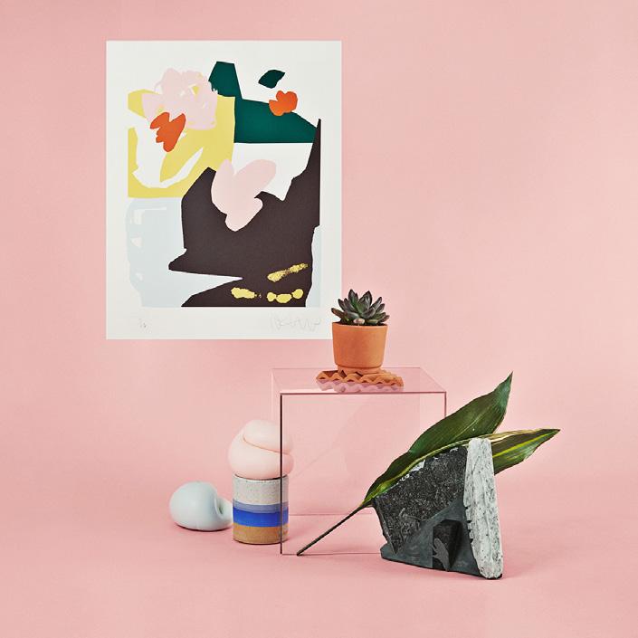 Print by Scott Vradelis, from $400, see below Custom dining chair by Trnk, from $2,000, hello@shopyowie.com, Plaster stone look side table by Elizabeth Loux, $600, buy at YOWIE