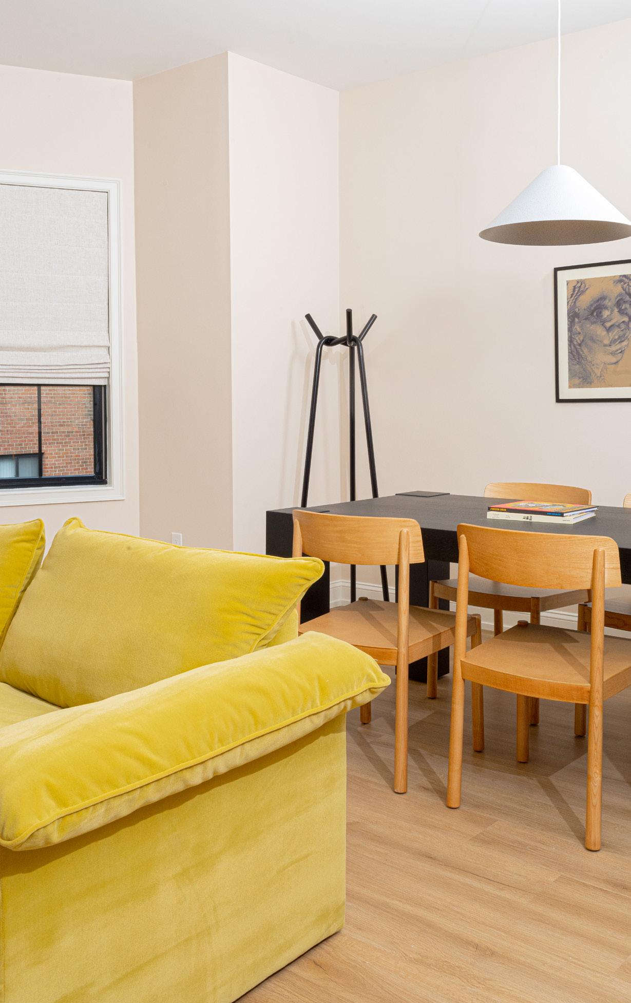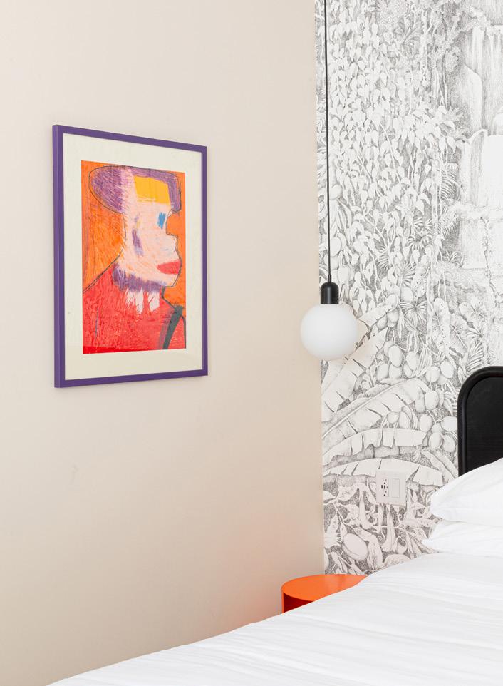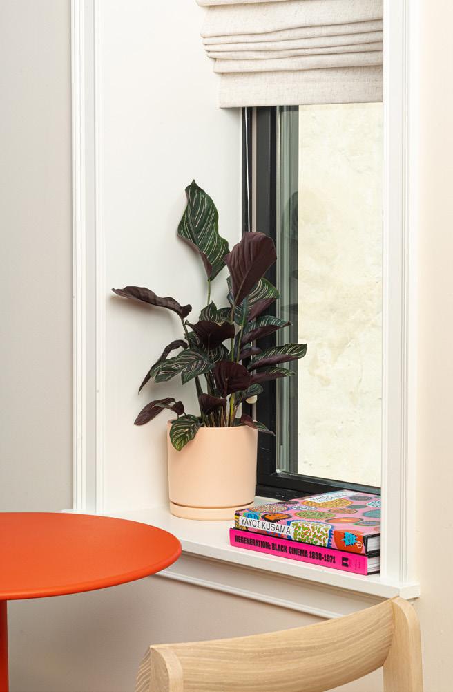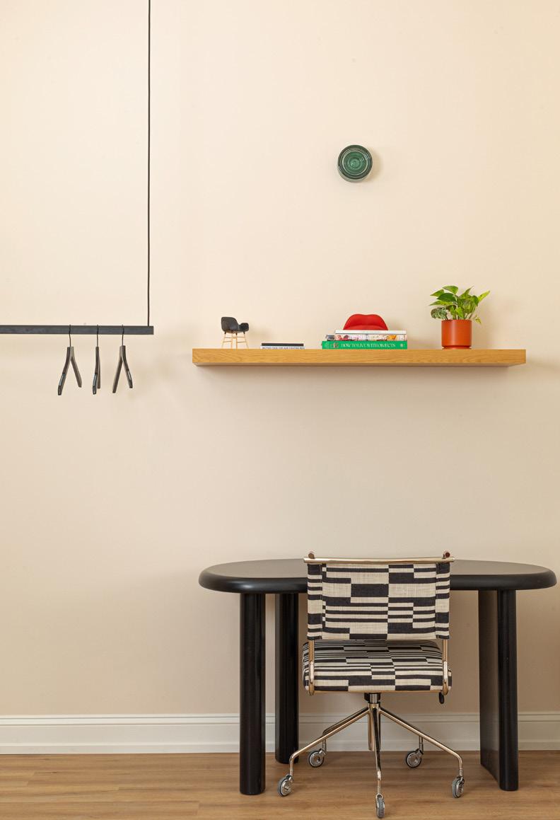 Living room details: Custom vintage sofa, expert reupholstery by Outline Upholstery, price upon request, steve@outlineupholstery.com, White side table by Christopher Al-Jumah, imshi.co, Muuto table, sourced second hand. Wallpaper is Grande in Beetlejuice, dropitmodern.com, Sobro dining table by Crate & Barrel, $999, crateandbarrel.com, Timb chair by Normann Copenhagen, $620 Each, hello@shopyowie.com, 20” Dune pendant in stone by Andrew Neyer, starting at $199, Andrewneyer. com, Knit coat rack by HAY, $199, available at YOWIE, Orange vase in window is NFS, by Scout Cartagena, similar works at scoutcartagena.com