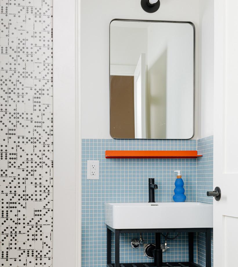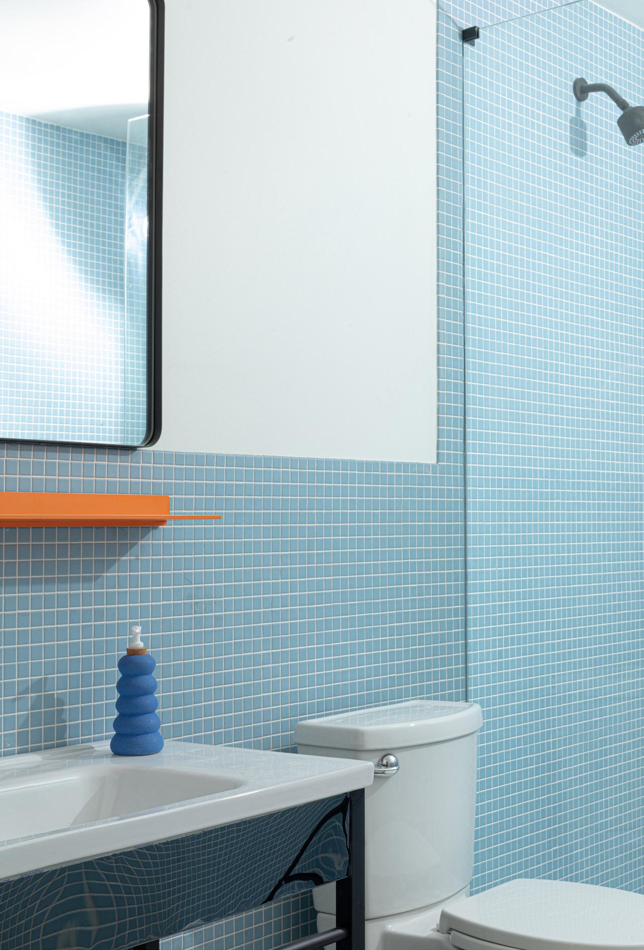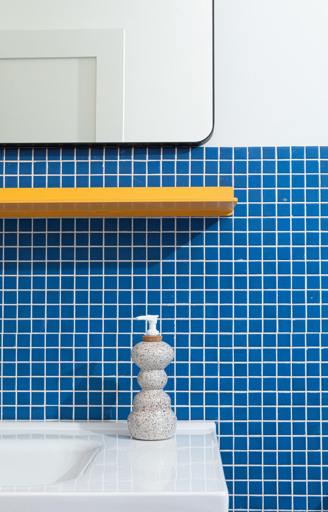 All of our suite bathrooms feature Keystones tile on our floor and walls from our partner Daltile. This Suite uses Nautical Blue D621 and a custom mosaic by YOWIE on the floor. Shelf is Tromso 1 by Shelfology, see at shelfology.com, reach out to hello@shopyowie.com for help customizing. The custom soap dispenser is by Cloud 9 Clay and available at shopyowie.com