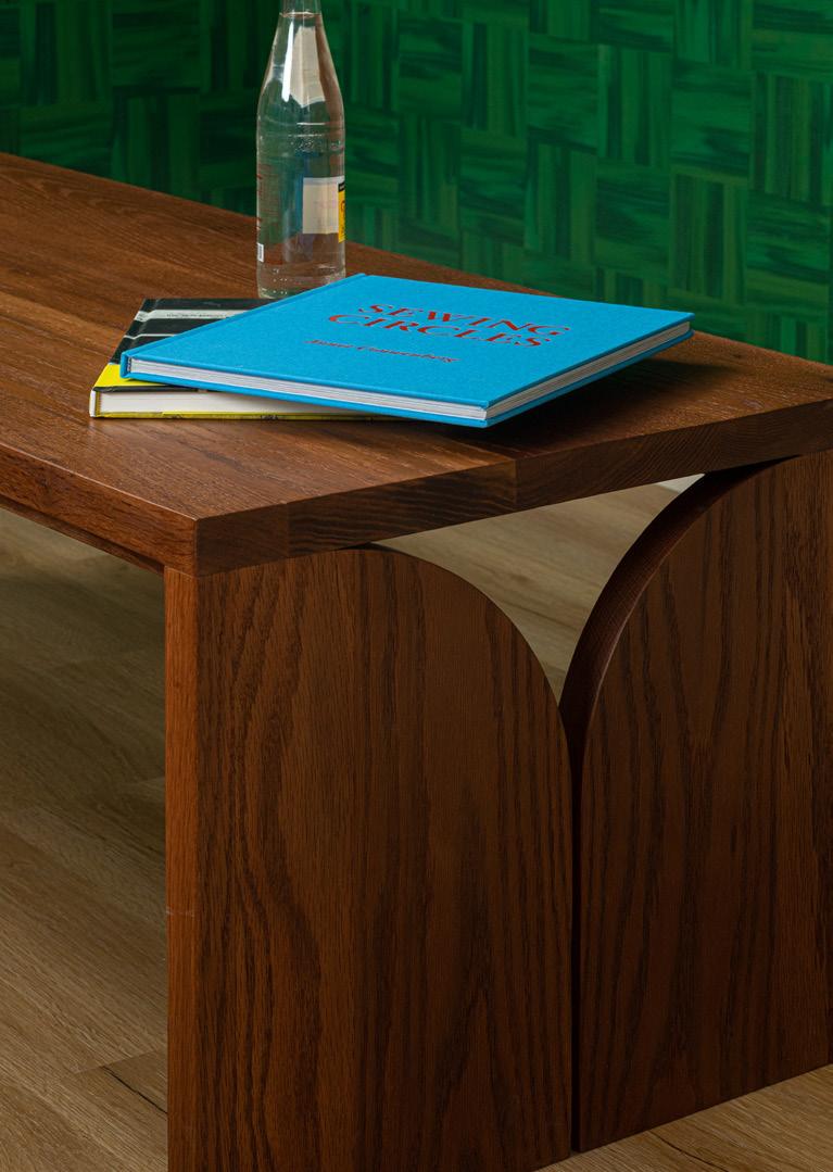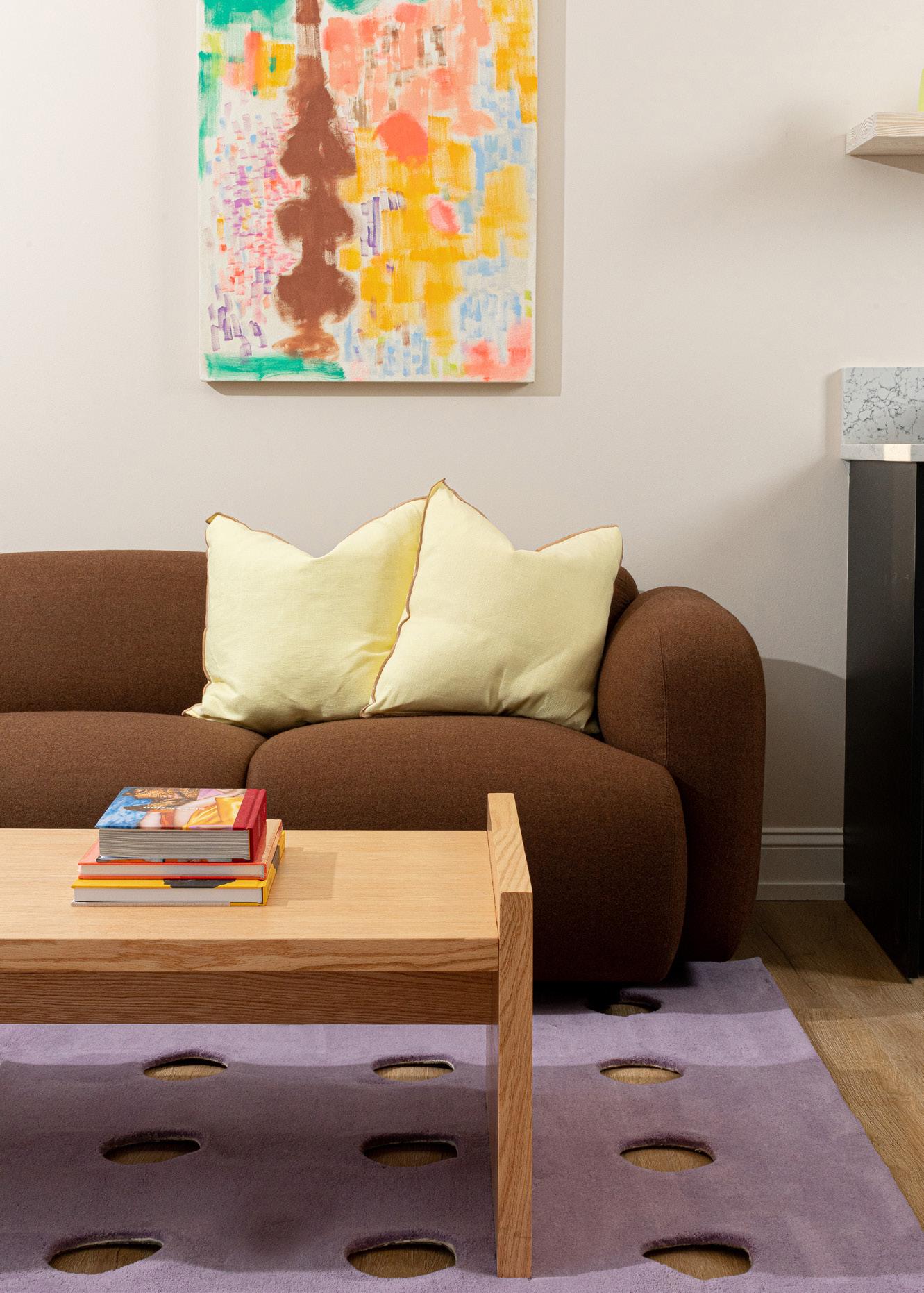 Artwork by Garrett Morrin $1,000, theseldomreader@gmail.com, Outline pillow by HAY $65, available at YOWIE, Coffee Table by Breck Brunson $2,550 contact Breckbuilt@pm.me and Wool 5’ x 8’ rug by Bi-Rite $950, biritestudio.com, All books available at shopyowie.com