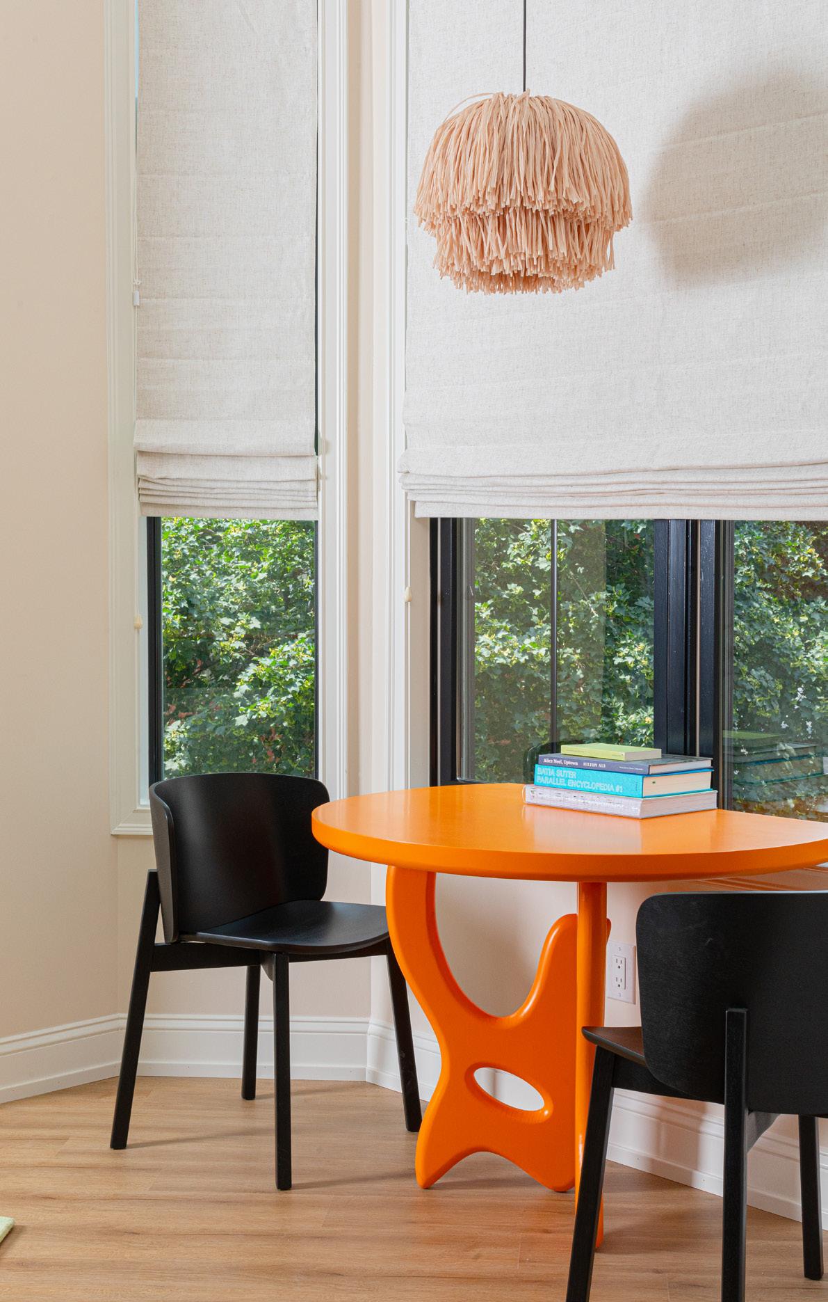 Living room details: Souvenir sofa in Landa Stone by Blu Dot, $3,695, hello@shopyowie.com, Wool 5’ x 8’ rug by Bi-Rite $950, biritestudio.com, Custom table by Billy Dufala, NFS, see more dufalabrothers.com, Buddy chair by Blu Dot, $550, hello@shopyowie.com, Custom orange table by from $1,200, Paradise Gray, paradisegray.com