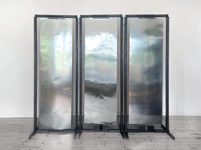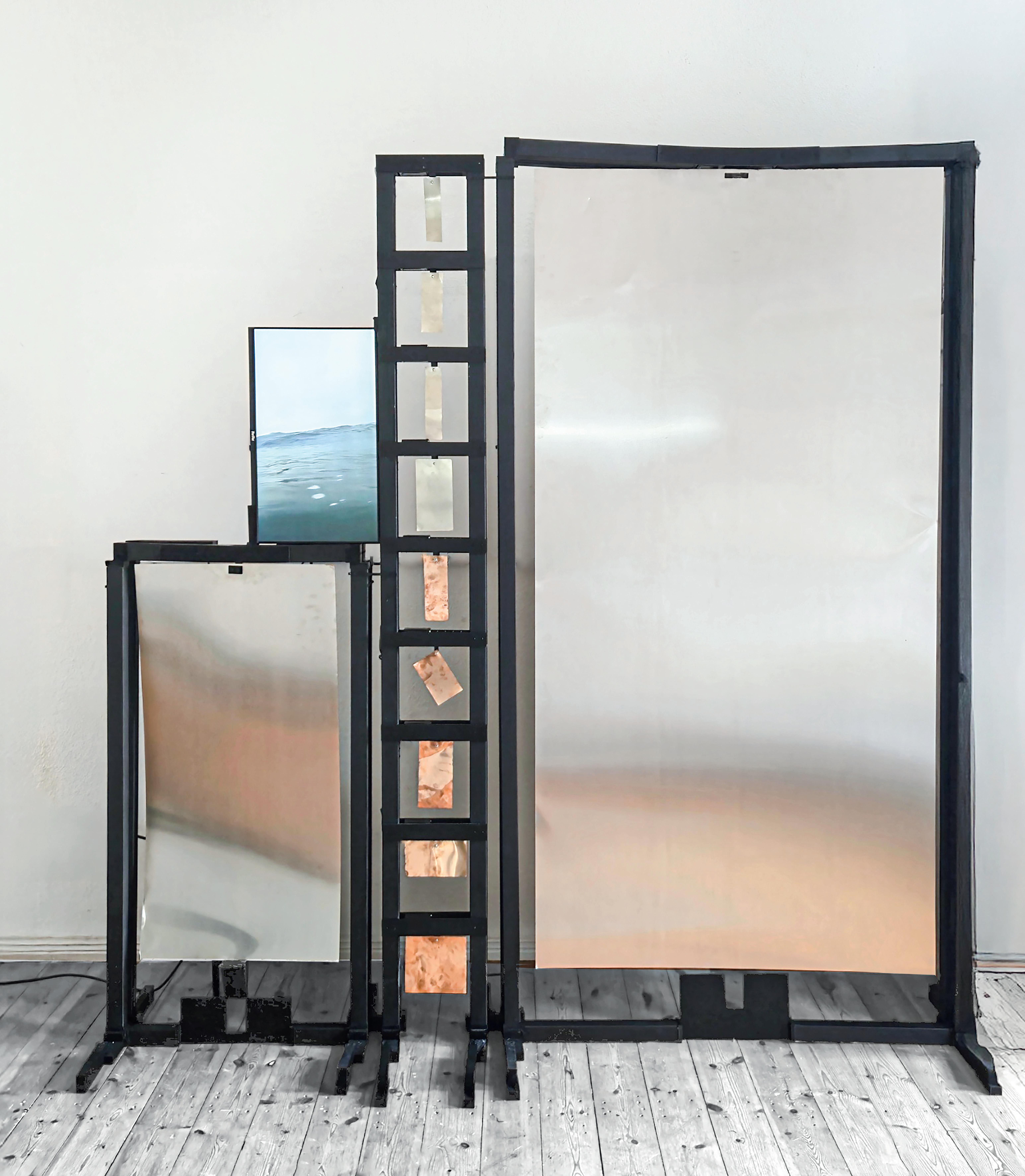 Motorised metal sheets, wind machines, video projection, images, and sculptures.