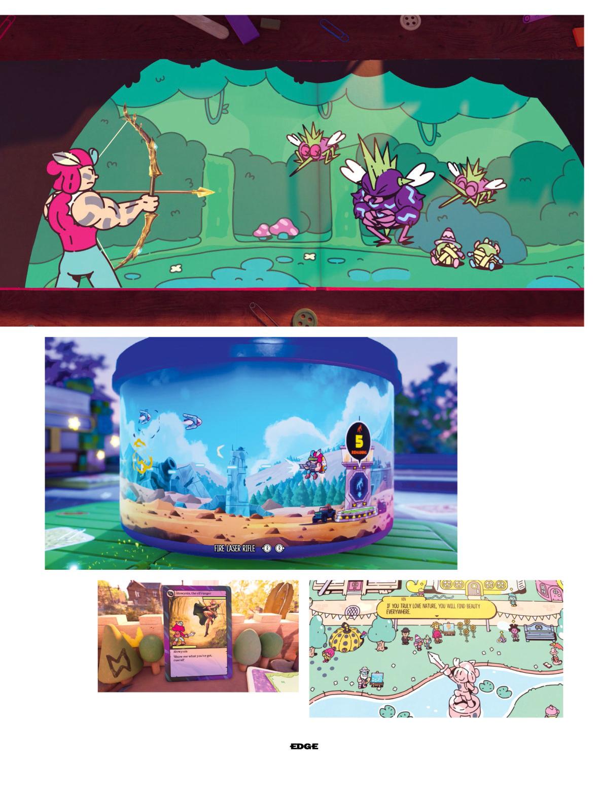 And then, like that, you’re outside, amid paint pots and headphones, buttons and paperclips, all looming large in three dimensions It’s an uncanny yet gleeinducing transformation, and one that doesn’t lose its lustre even once you’re hopping in and out at will. First, though, you need to explore Sam’s desk The boy himself is never present, but his toys, drawings and arts and crafts paraphernalia litter the surface, creating walls, ramps and platforms, freshly rearranged each time you visit (This would be a much more straightforward adventure, albeit a less exciting one, if Sam tidied his room once in a while ) Initially, minus your sword, you have to sneak past aggressive beetles that Sam apparently keeps as pets in order to reach a magic item of your own Once you have it, you can use green portals to literally move between dimensions, even slipping into Sam’s sketches, and later the likes of a cardboard model of a volcano unhelpfully adorned with dinosaurs