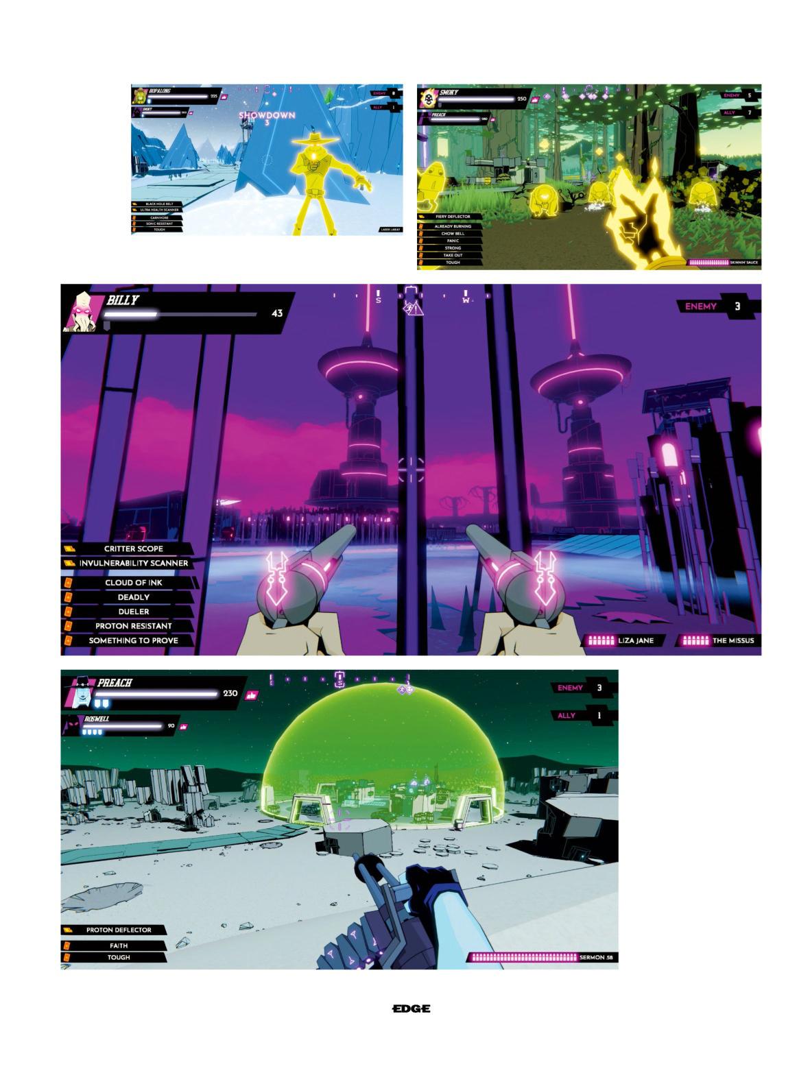 TOP Allied critters are useful for flushing out and distracting enemies while you focus on finding the ideal angle of attack MAIN In a distinctive visual motif, holographic neon is used to mark out all sorts of details, from shop signs to the hammer of a revolver LEFT Battle locations run the gamut from sci-fi swamps to lunar bases and saloon-centred frontier towns