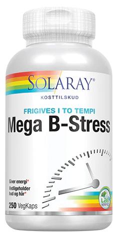 Mega B-Stress fra Solaray er med til at vedligeholde din krop i perioder, hvor der er ekstra meget at se til. Et unikt B-vitaminkompleks med B2, B3, B5, B6, B12 foruden magnesium og vitamin C - der alle bidrager til normalt energistofskifte og til at mindske træthed og udmattelse.
