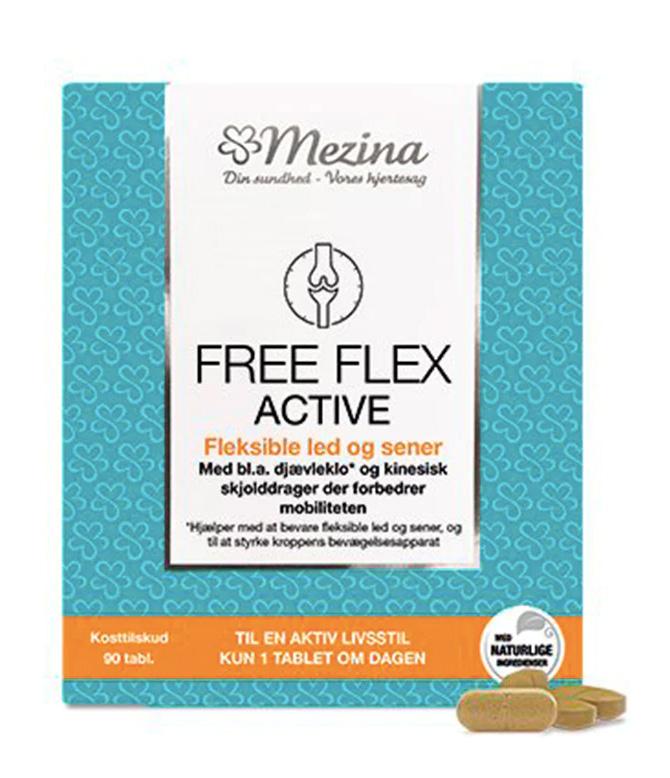 Free Flex Active fra Mezina er et kosttilskud, der med sin unikke sammensætning henvender sig til personer, der ønsker at bevare eller påbegynde en aktiv livsstil, hvor der tages ekstra vare på led og lednære omgivelser.