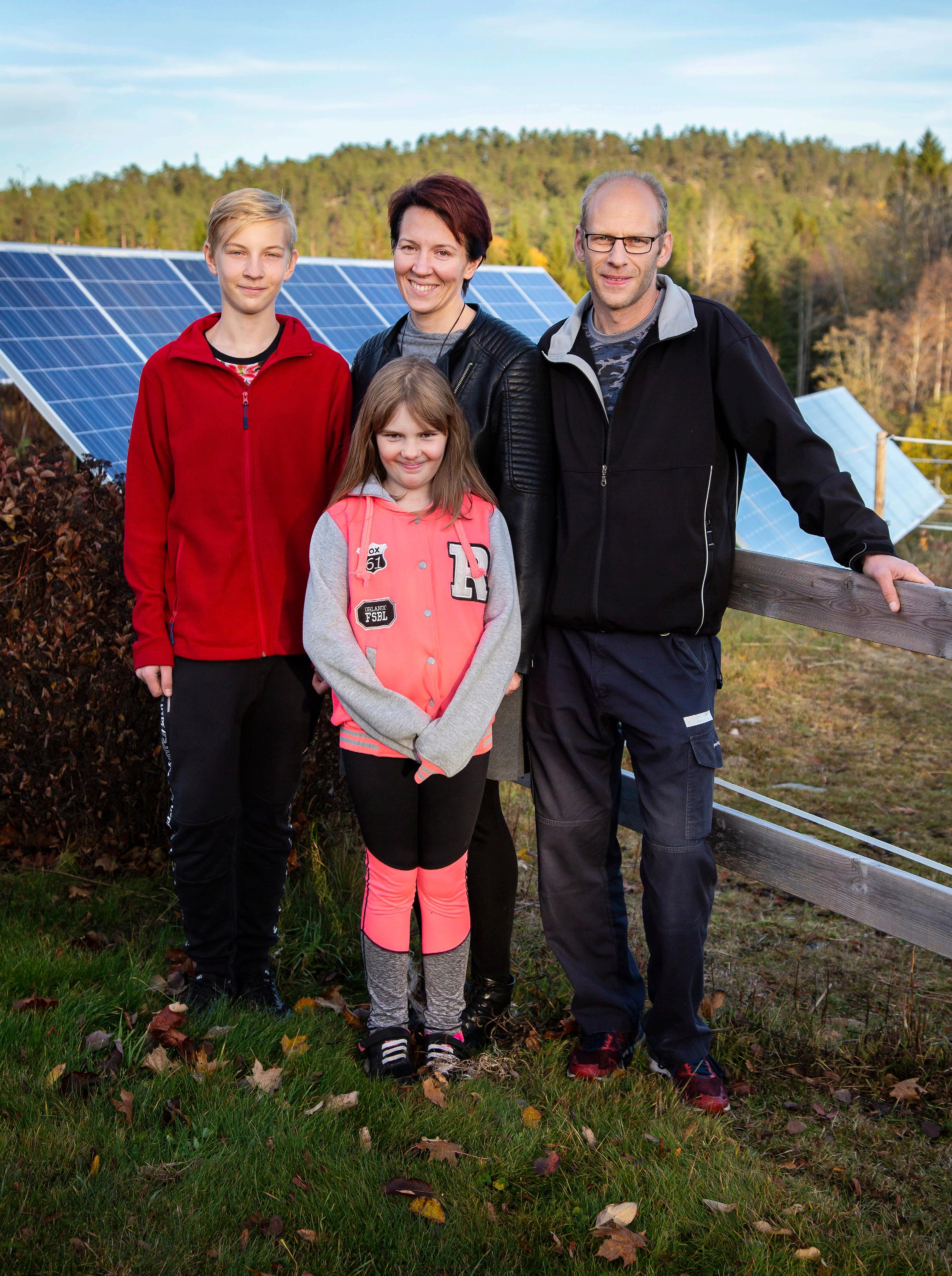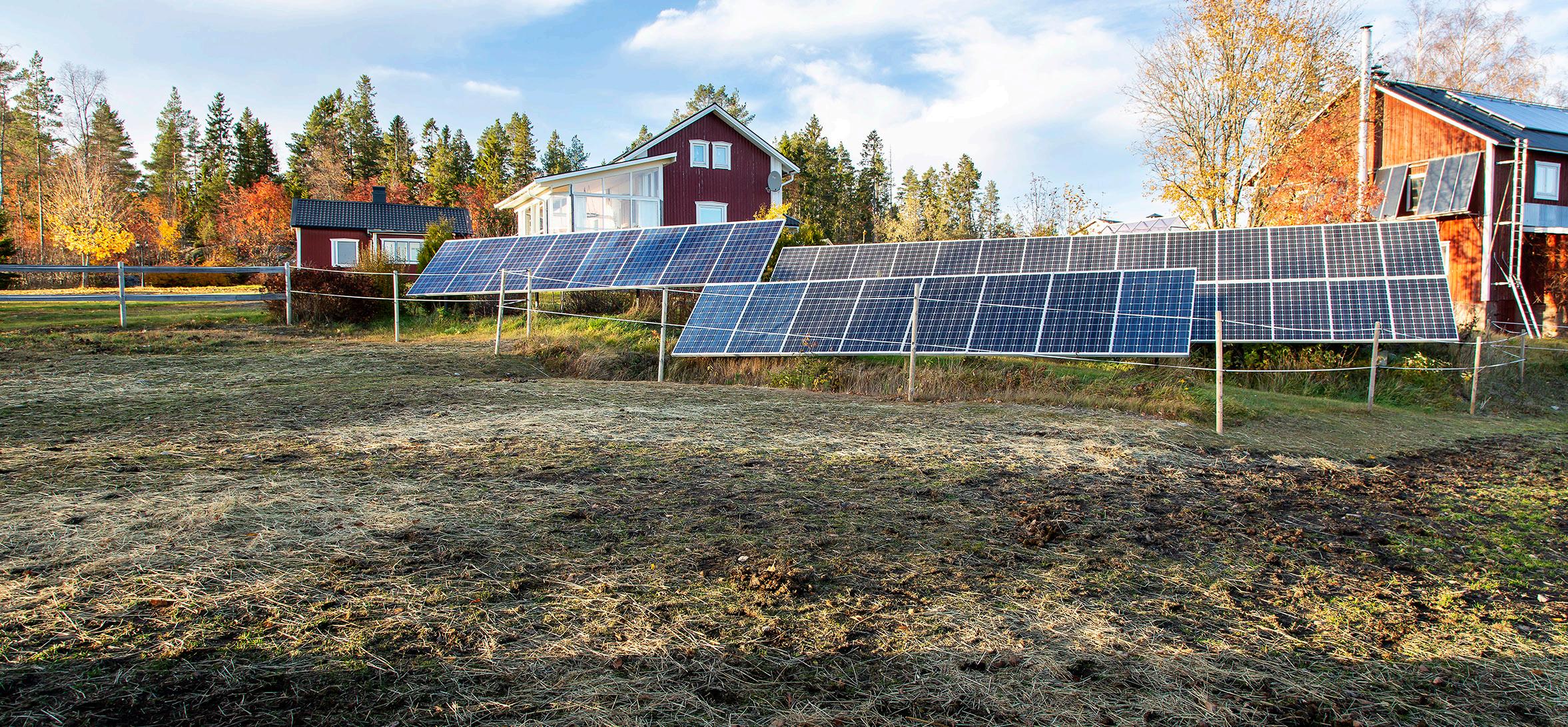 Vart man än vänder sig på gården i Vangsta finns solpaneler uppsatta. Sammanlagt drygt 160 kvadratmeter. Men så är också familjen Hägglund i princip självförsörjande på el och varmvatten. Elbil, källsortering och genomtänkta inköp kompletterar familjens miljötänk.