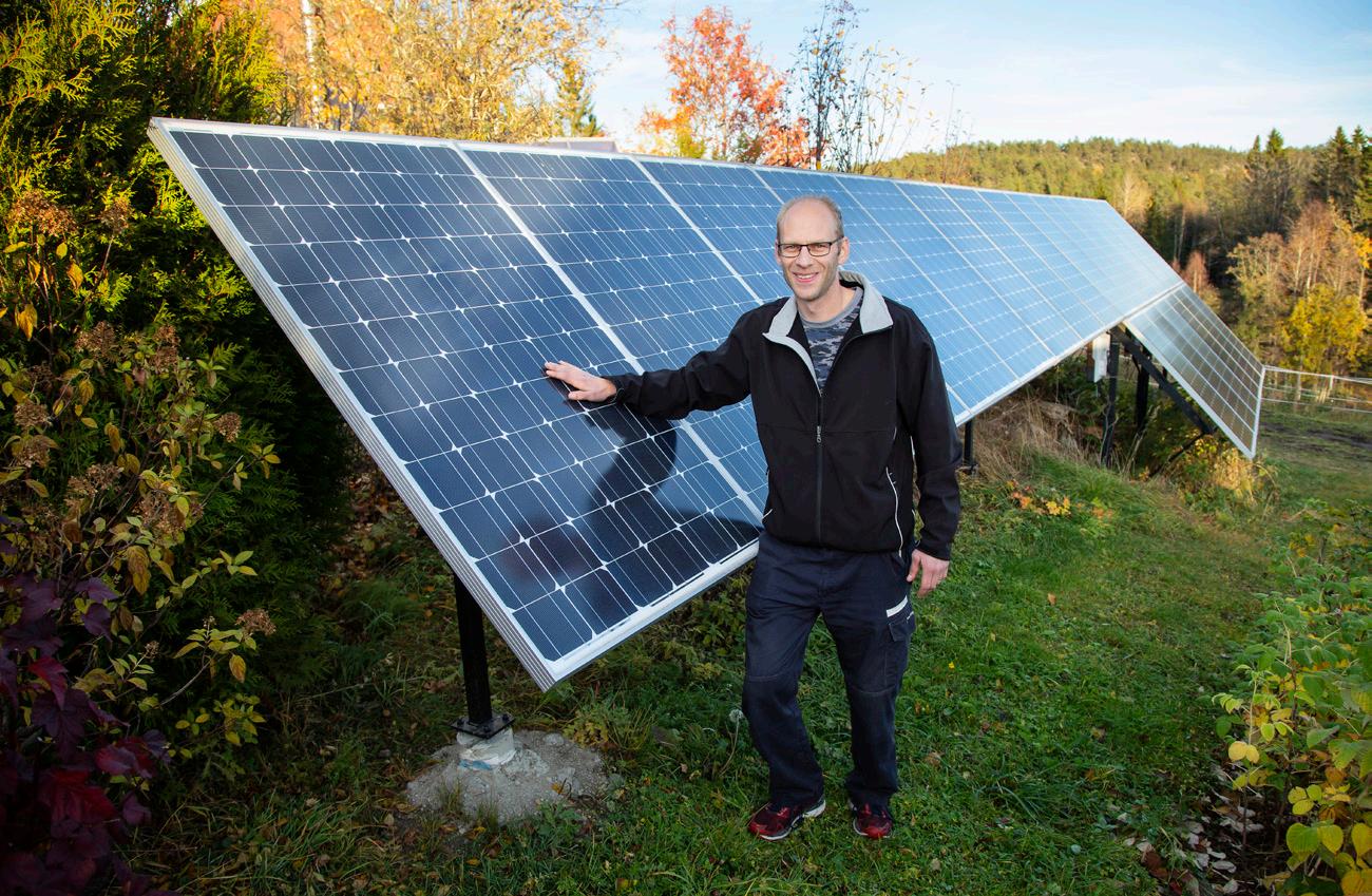 – Vintertid spetsar vi lite med flis, annars klarar vi oss bra på vår egen el, även när elbilen står på laddning, säger Johan belåtet. Överskottet under andra delar av året säljer vi och skickar ut på elnätet.