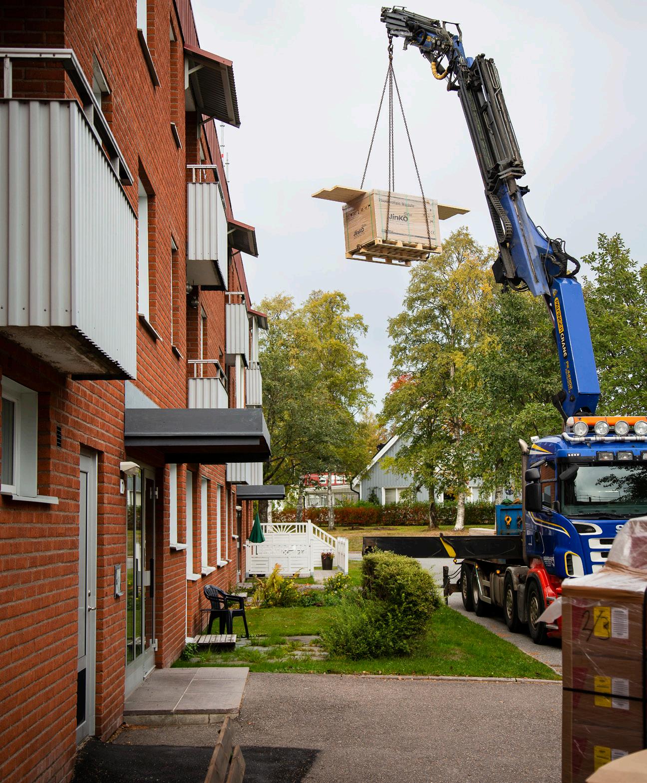 Montage av solcellspanelerna gick i ett rasande tempo hösten 2018. Efter sex veckor var arbetet klart och taken på fem av föreningens sex hus hade förvandlats till elproduktionsanläggningar.