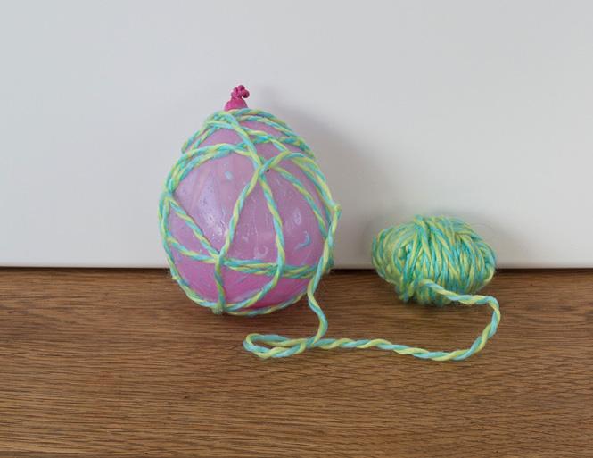 Börja med att blåsa upp ett antal vattenballonger. Krävs lite extra lungkapacitet här! Dra lite i dem innan du blåser så går det lättare. Pensla på lim och vira sen garnet flera varv runt ballongen. Låt torka!