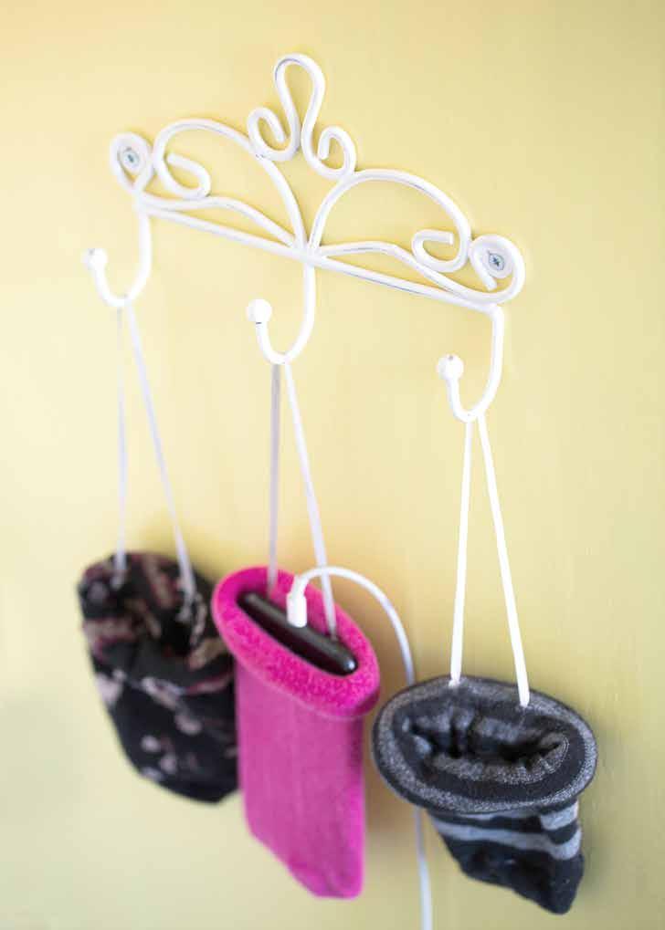 Rulla upp strumpan en bit. Sy fast banden enligt bild och häng upp på krokar. Placera ett grenuttag strax under krokarna. Sov gott !