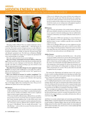 5IVIOQVO I NIKQTQ\a Q[ LQâ&#x20AC;ŤŮťâ&#x20AC;ŹK]T\ <PMZM IZM KW]V\TM[[ UIQV\MVIVKM IVL WXMZI\QWV[ IK\Q^Q\QM[ \PI\ U][\ JM KWUXTM\ML LIQTa ¸ \I[S[ \PI\ QVKZMI[M WV M^MV\ LIa[ 8ZM^MV\I\Q^M XZIK\QKM[ \PW]OP VMKM[[IZa IZM WN\MV LQâ&#x20AC;ŤŮťâ&#x20AC;ŹK]T\ \W keep up with during the everyday schedule of these spaces. By not engaging in proactive maintenance, a facility can often face increased energy usage IVL ]T\QUI\MTa WXMZI\QWVIT KW[\[ <PM Ă&#x2026;MTL \MIU I\ 0MVLMZ[WV *]QTLQVO ;WT]\QWV[ PI[ KWUXQTML [WUM ]VQY]M _Ia[ \W QUXZW^M \PM WXMZI\QWVIT Mâ&#x20AC;ŤŮťâ&#x20AC;Źciency and functionality of your facility. First, take a quick assessment of your current challenges. Has your energy consumption increased without a clear reason? A slow increase in energy use day-to-day doesnâ&#x20AC;&#x2122;t seem like much, but over time this can create a big impact on the bottom line. Although this is typically a slow drift, it is certainly something to pay close attention to and take necessary precautions to avoid. Have there been noticeable changes in your equipment usage levels? 1N aW] PI^MVÂź\ UILM UWLQĂ&#x2026;KI\QWV[ \W aW]Z NIKQTQ\a \PI\ _W]TL M`plain the increased load, you may be able to recover â&#x20AC;&#x153;lostâ&#x20AC;? capacity by employing some simple practices. Have you noticed an increase in comfort complaints? This doesnâ&#x20AC;&#x2122;t mean you need a new system or equipment, but it does show that aW]Z K]ZZMV\ QVNZI[\Z]K\]ZM KIV WXMZI\M UWZM Mâ&#x20AC;ŤŮťâ&#x20AC;ŹKQMV\Ta _PQTM QUXZW^QVO comfort to your occupants. + KIZJWV LQW`QLM :0 ZMTI\Q^M P]UQLQ\a IVL IQZĂ&#x2020;W_ [MV[WZ[ IZM \PZMM WN \PM JQOOM[\ K]TXZQ\[ _PMV M`IUQVQVO \PM[M Q[[]M[ <PMa OW W]\ WN calibration the quickest and can have major impacts. CO2 Sensors Â&#x152; .IKQTQ\a [\Iâ&#x20AC;Ť[ Ůşâ&#x20AC;ŹPW]TL ZM^QM_ +72 LI\I \ZMVL[ M^MZa [Q` UWV\P[ \W QLMV\Qfy drift or calibration loss of sensors. Failure to monitor this data leads to ]VLMZ IVL UWZM KZQ\QKITTa W^MZ^MV\QTI\QWV _PQKP KIV PI^M I [QOVQĂ&#x2026;KIV\ impact on both occupant comfort and energy use. â&#x20AC;˘ CO2 sensors should be calibrated using a calibrated device and calibra\QWV OI[ I\ TMI[\ M^MZa Ă&#x2026;^M aMIZ[ 1N \PM [MV[WZ[ IZM M`XW[ML \W IQZ[\ZMIU[ \PI\ KWV\IQV KPMUQKIT[ [QOVQĂ&#x2026;KIV\ L][\ WZ W\PMZ LMJZQ[ [W]ZKM[ UWZM frequent calibration may be required to maintain optimal performance. â&#x20AC;˘ If a CO2 sensor cannot be calibrated, then it should be replaced. If \PM [MV[WZ Q[ š[MTN KITQJZI\ML Âş \PMa IZM IK\]ITTa [MTN KWZZMK\QVO ¸ VW\ [MTN KITQJZI\QVO ¸ IVL IZM WN\MV VW\ IKK]ZI\M -^MV \PM[M LM^QKM[ VMML \W JM ^MZQĂ&#x2026;ML ZMO]TIZTa 34 Facility Manager Magazine