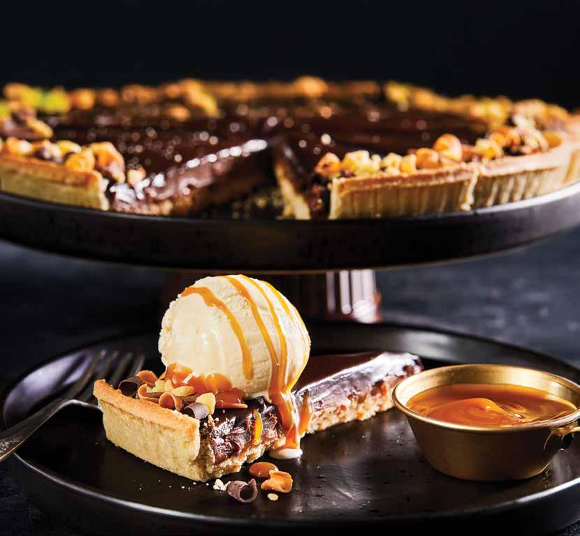 A butter pastry case filled with salted caramel and Belgian chocolate ganache, glazed and decorated with caramel and dark chocolate curls, chocolate flake pieces and honeycomb. Perfect served with Signature by Country Range Dairy Vanilla Ice Cream.