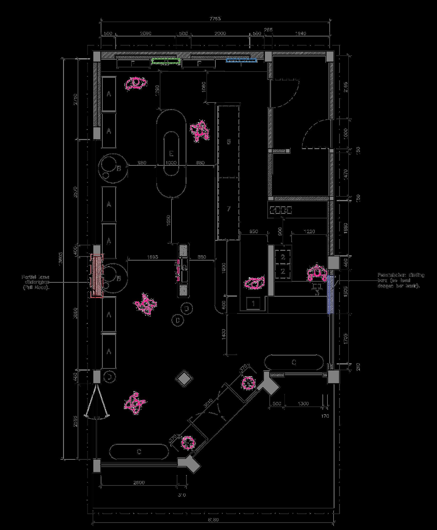 The existing site utilizes high ceilings and large glass windows, oriented directly towards the view of the Pakuwon City complex.
