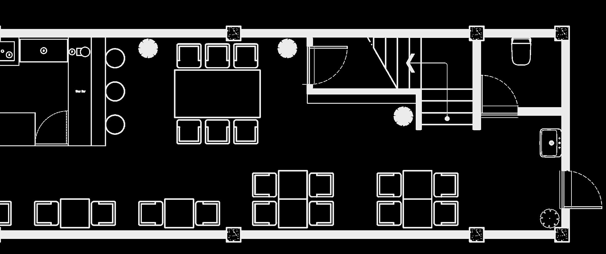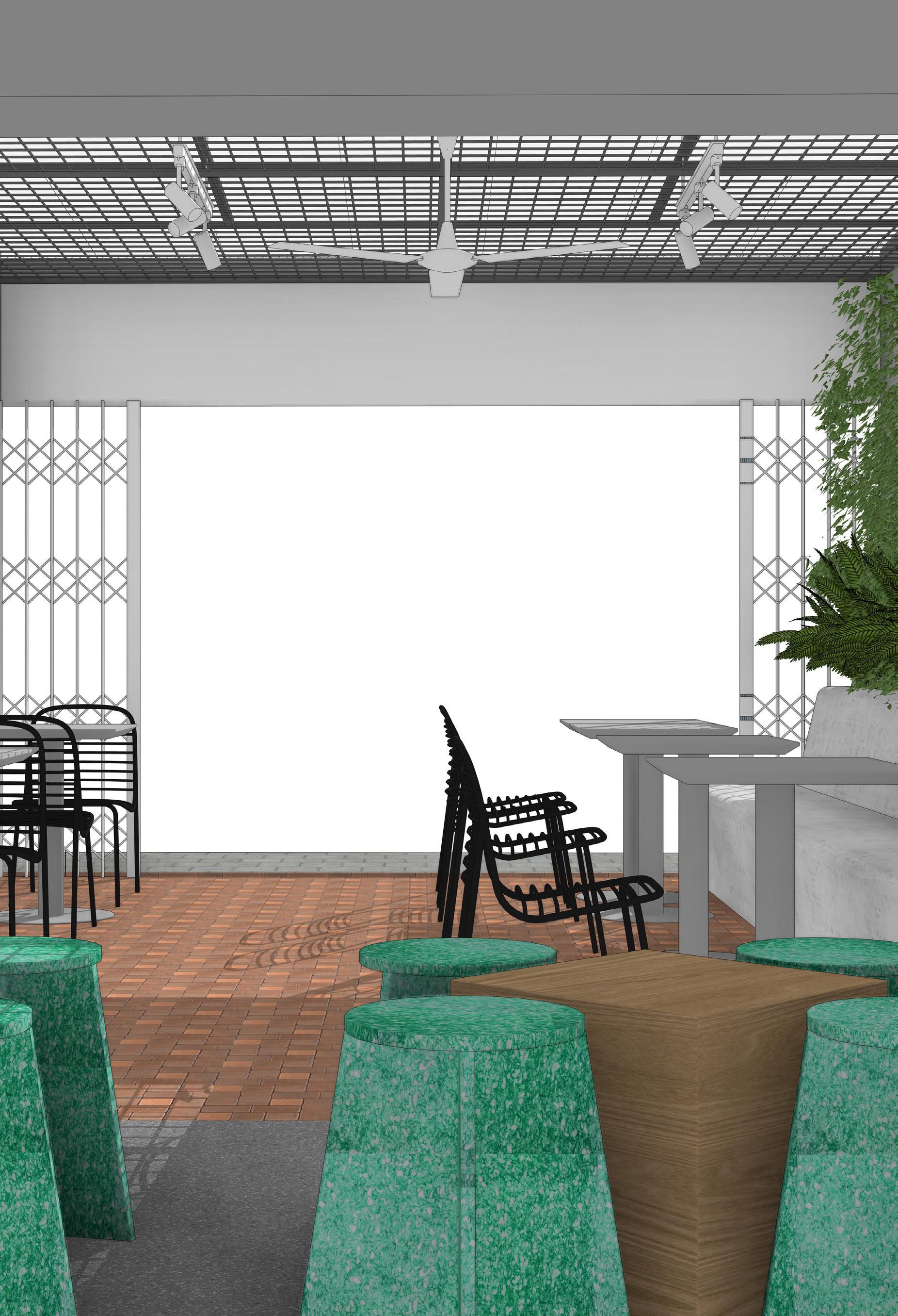 The existing design extends long to the back, with a building width of only 4,2 meters. The coffee shop has a capacity of 45 people (more if stools are added). The indoor area is primarily used for working or Work From Coffee (WFC). There is also an outdoor area designated for smoking, featuring a variety of different furniture.