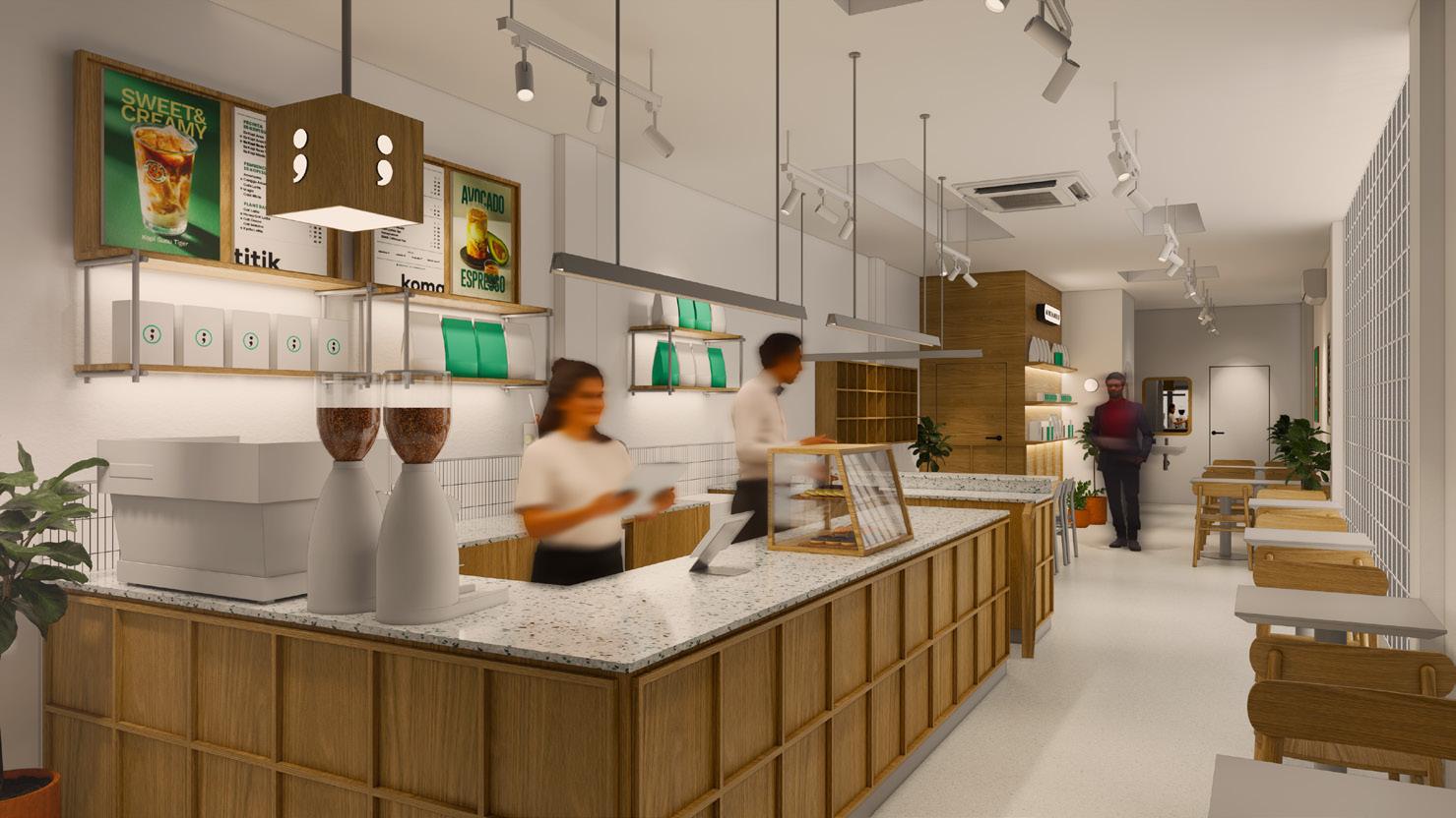 Touches of concrete, neutral colors, and a warm café atmosphere create an enjoyable experience for visitors at Titik Koma.