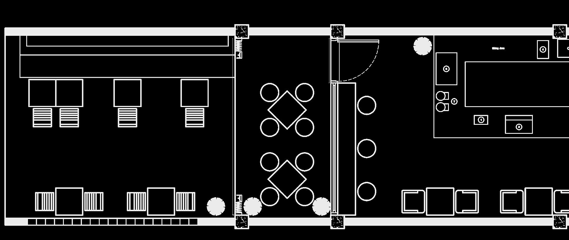 Located at the corner of the street, connected building to the restaurant. It has a low ceiling on existing and an angled room orientation. It offers good visibility due to its direct view from the main road.