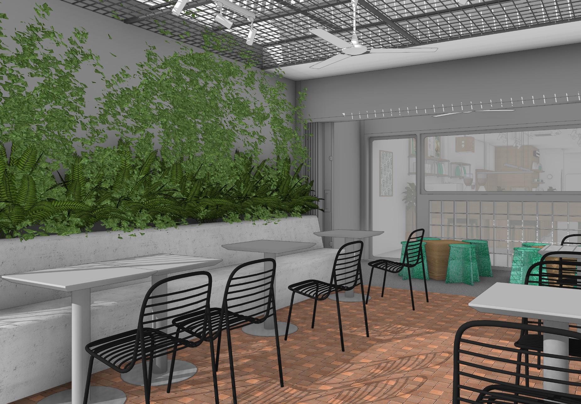 The shop has an existing long shape extending to the back, with two zones, an outdoor front area and indoor area.