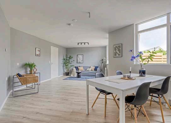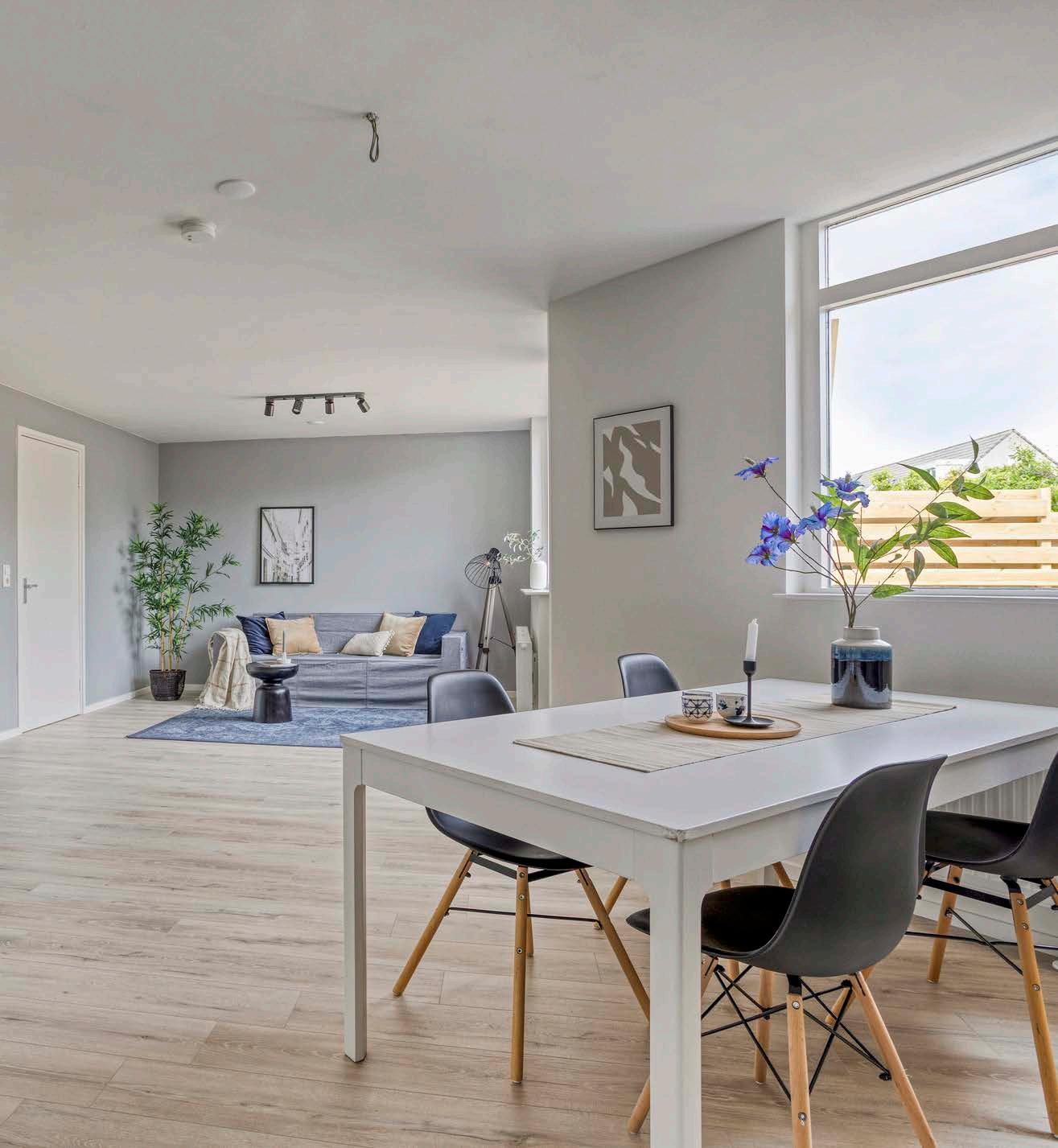 De woonkamer straalt licht en ruimte uit door de grote ramen en deur naar de tuin. Een perfecte plek voor ontspanning. En in de zomer schuif je zó de deur open voor frisse lucht of gezellig tuinplezier.