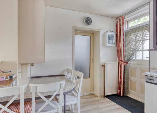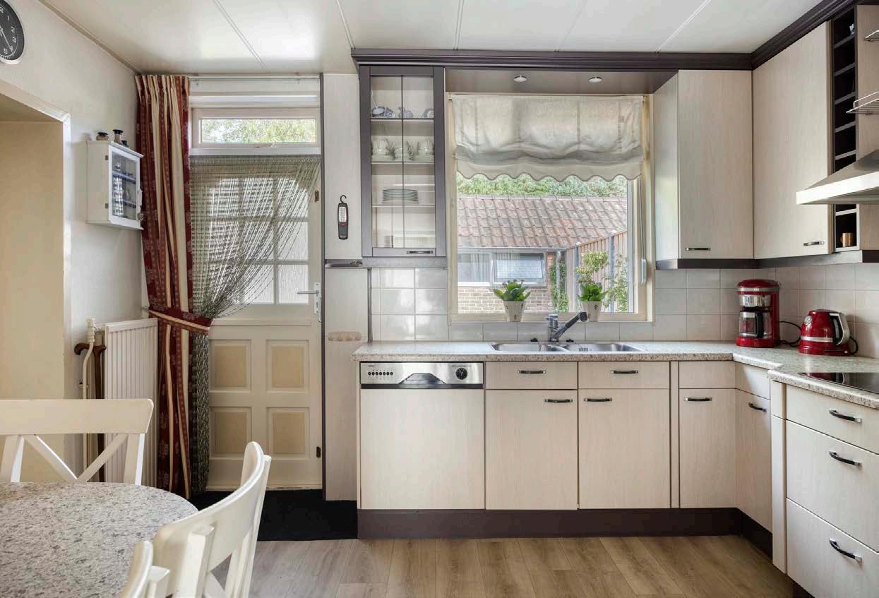 Aan de achterzijde van de woning bevindt zich de half open keuken. Deze is functioneel en biedt voldoende opbergruimte voor pannen, servies en boodschappen. Via de keuken loop je zo de achtertuin in.