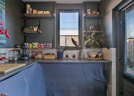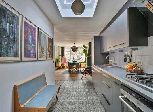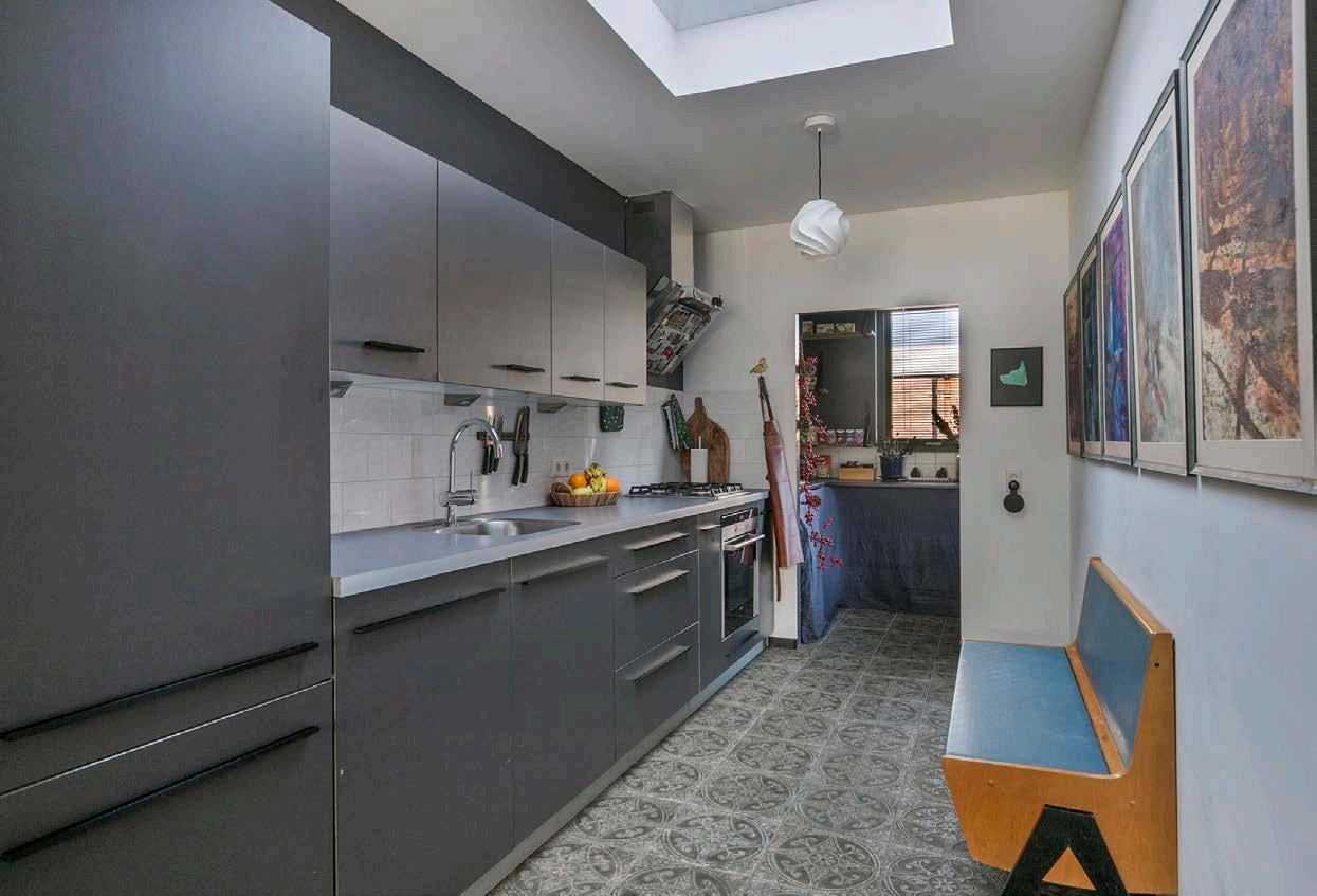 De gezellige keuken aan de achterzijde staat in open verbinding met de lichte woonkamer, deel is afgewerkt met strak stucwerk en een prachtige houten vloer/Spaanse tegelvloer. De keukeninstallatie, compleet met gaskookplaat, afzuigkap en vaatwasser, maakt koken een plezier.