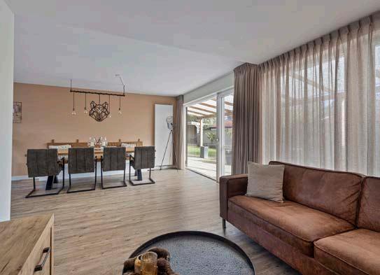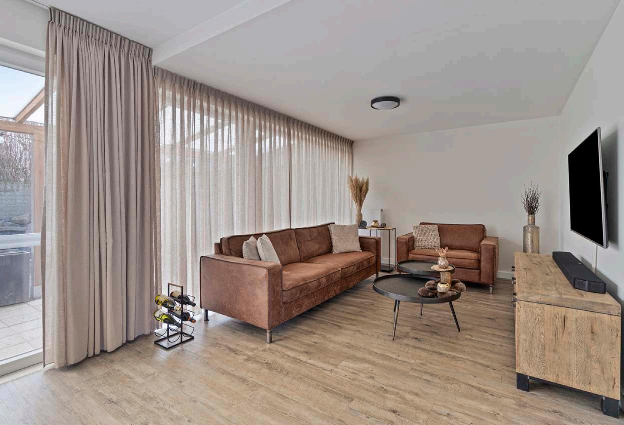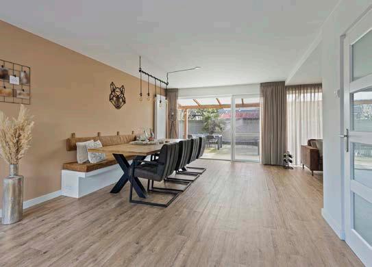 De woonkamer vormt het stralende middelpunt van de woning. Dankzij de grote raampartijen stroomt er een overvloed aan natuurlijk licht naar binnen, wat een warme en uitnodigende sfeer creëert. Het uitzicht op de prachtig aangelegde tuin geeft een gevoel van ruimte en verbondenheid met de natuur. Deze royale leefruimte biedt voldoende mogelijkheden voor diverse interieurstijlen en is perfect voor zowel ontspanning als entertainment. Hier kun je genieten van gezellige avonden met familie, of simpelweg ontspannen met een goed boe