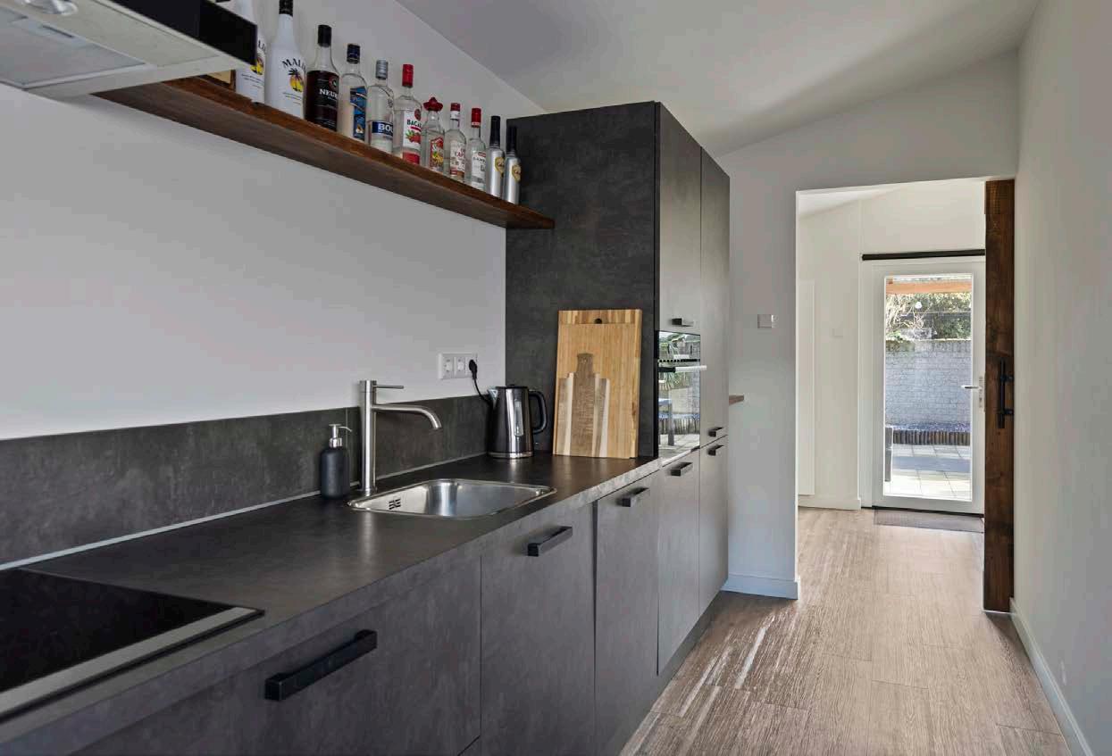De keuken is een droom voor iedere kookliefhebber. Met een praktische, rechte opstelling is er volop werkruimte en de hoogwaardige inbouwapparatuur maakt koken hier een waar genoegen. Van snelle doordeweekse maaltijden tot uitgebreide diners voor vrienden en familie, deze keuken is ontworpen om aan al je culinaire wensen te voldoen. De stijlvolle afwerking en slimme indeling zorgen voor zowel functionaliteit als esthetiek, wat deze ruimte tot het kloppende hart van het huis maakt.