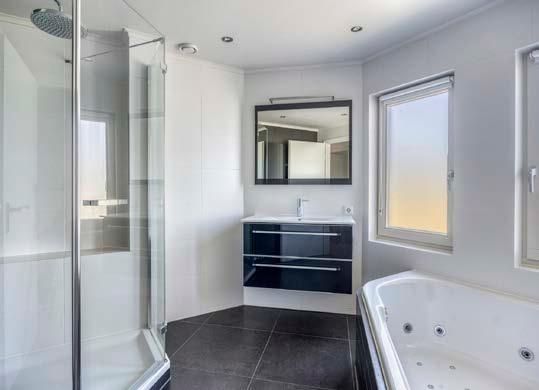 De badkamer, geheel modern en strak afgewerkt, beschikt over een whirlpool, een aparte douche, een wastafelmeubel en een toilet – alles wat je nodig hebt voor een frisse start van de dag of een ontspannen afsluiting ervan.