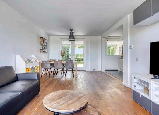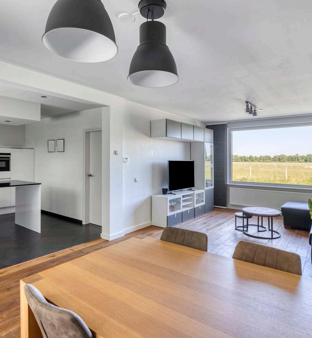 Laten we even binnenstappen. De voordeur opent naar een lichte en uitnodigende hal die al meteen een vleugje van wat komen gaat prijsgeeft. Vanuit hier betreed je de riante woonkamer, die dankzij de grote ramen baadt in natuurlijk licht. De woonkamer loopt over in de eethoek; een plek waar lange avonden met vrienden of gezellige spelletjesmiddagen met de kinderen vanzelfsprekend worden. De ambiance? Warm en uitnodigend, perfect voor elk seizoen – van knusse winteravonden tot zonnige zomermiddagen.