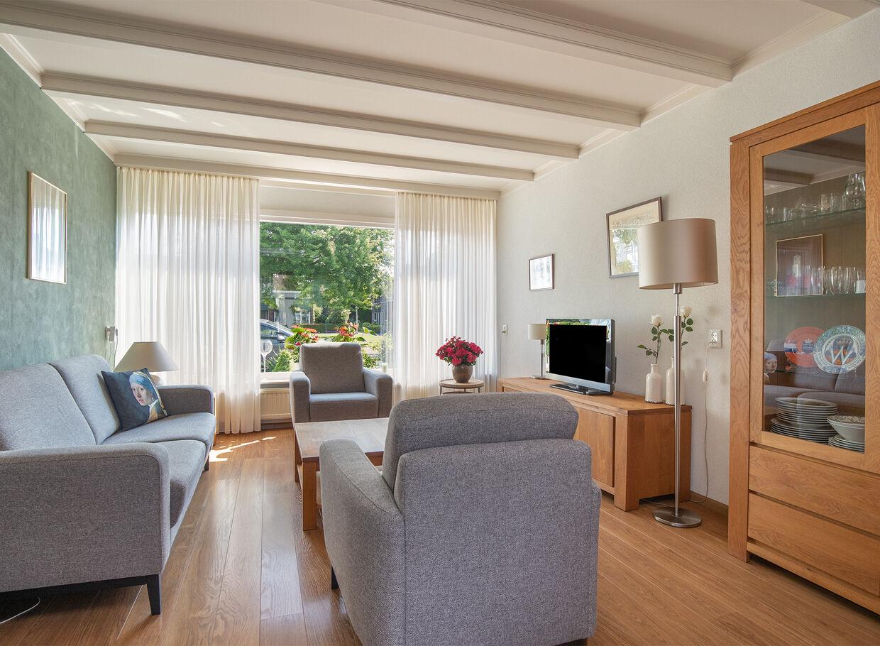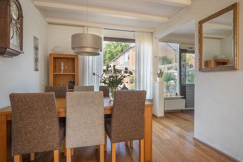 De woonkamer is goed bemeten en voorzien van grote ramen, waardoor er veel natuurlijk daglicht naar binnen valt. De woonkamer biedt genoeg ruimte om een gezellig zit-en eetgedeelte te creëren. Daarnaast is de ruimte keurig afgewerkt met een laminaatvloer, lichte kleuren op de wanden en een charmant balkenplafond.