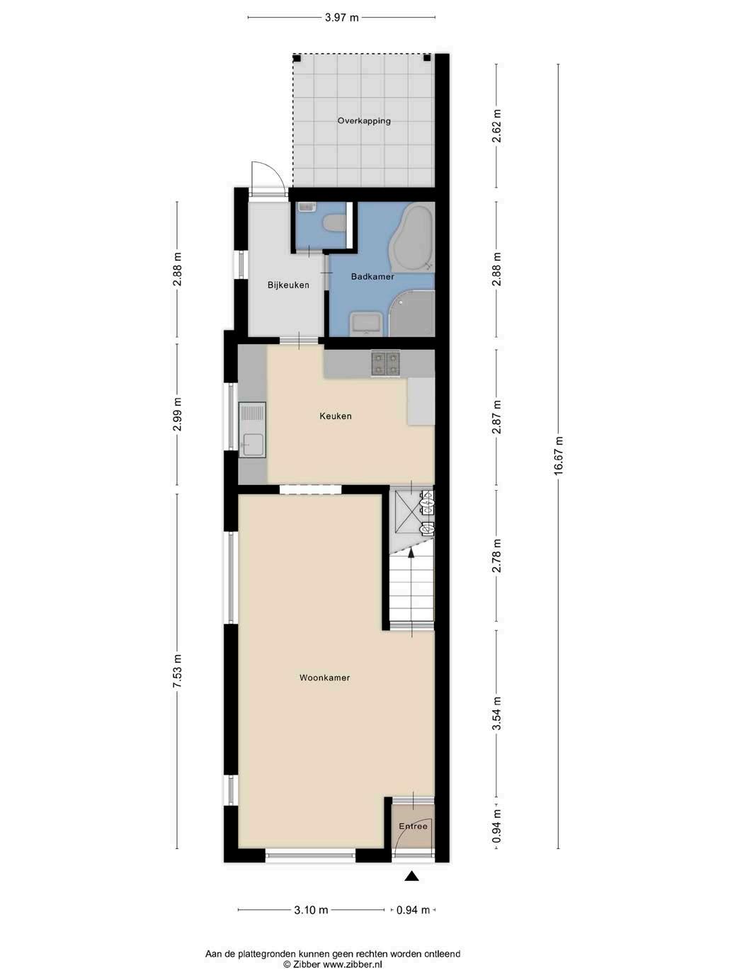De woning beschikt over een entree aan de vooren achterzijde. Wanneer je aan de voorzijde de woning binnentreedt stap je vanuit de hal direct de woonkamer in. Aan de achterzijde heb je via de entree toegang tot de toiletruimte, badkamer, keuken en vaste garderobe kast.
