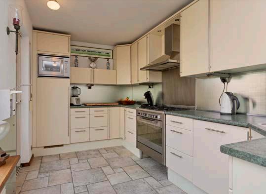 Loop verder naar de half open keuken. Deze is ruim opgezet en biedt veel werk- en opbergruimte dankzij de riante hoekopstelling. Je vindt hier alle inbouwapparatuur die je nodig hebt, zoals een 6 pits gaskookplaat, afzuigkap, koelkast, combi-oven + losse oven en een vaatwasser. Koken wordt een waar plezier in deze keuken!