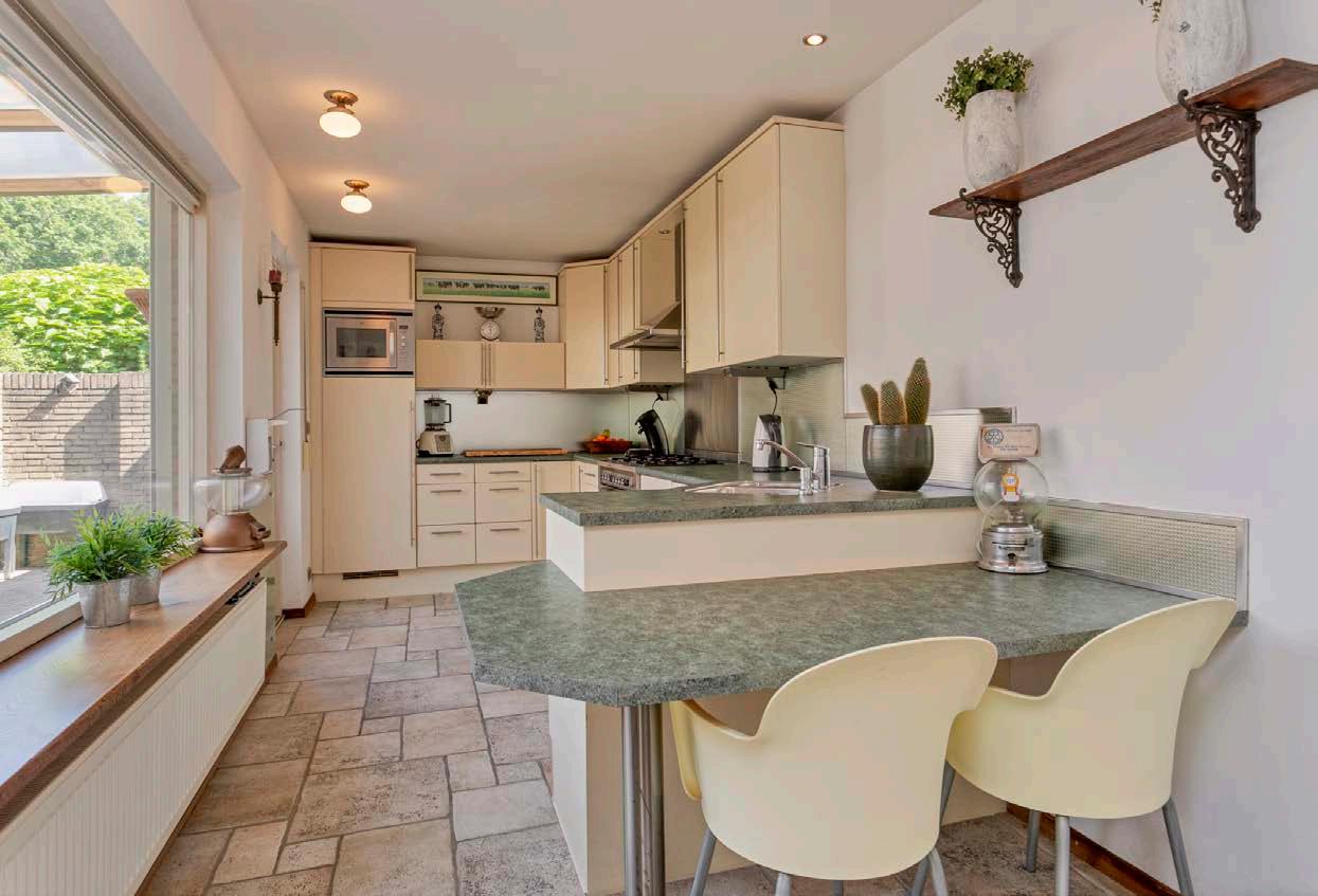 De benedenverdieping is aan de achterzijde gedeeltelijk uitgebouwd en is voorzien riante keuken. Het geheel is afgewerkt met een hoogwaardige stenen vloer. De moderne kleurstelling van de wanden en plafonds zorgt voor een frisse en rustige uitstraling. Mede dankzij de grote raampartijen aan de achterzijde en voorzijde valt het daglicht op aangename wijze naar binnen.