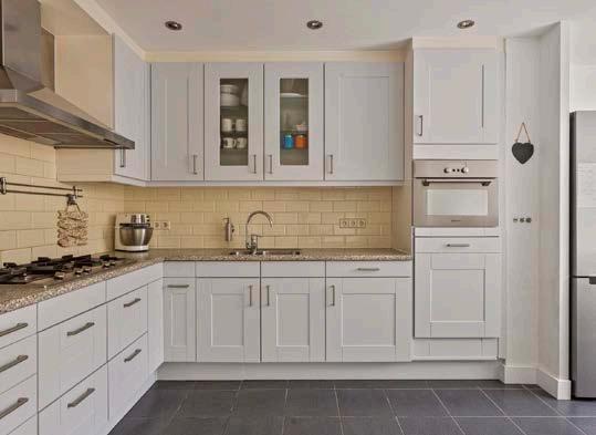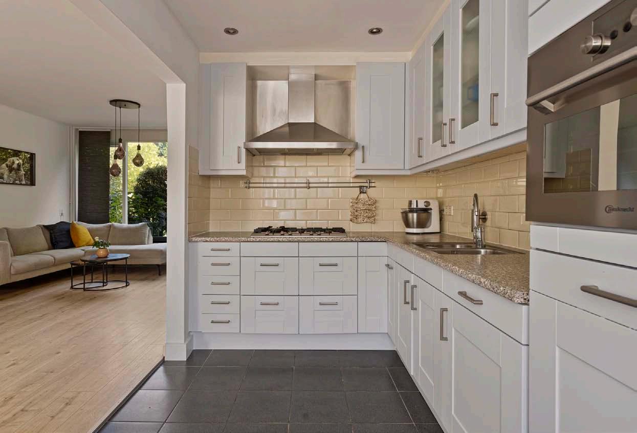 Aan de achterzijde van de woning bevindt zich de moderne keuken in L-opstelling. Uitgerust met alle benodigde inbouwapparatuur en voldoende opbergruimte, is deze keuken een droom voor elke kookliefhebber. Terwijl je een heerlijk diner bereidt, heb je een prachtig uitzicht op de fraai aangelegde tuin.