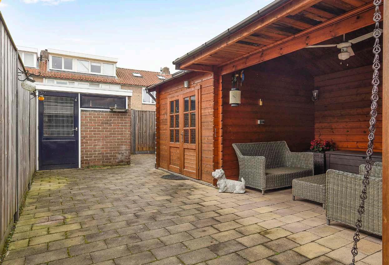 Achter de woning ligt de fijne tuin op het westen. De tuin is volledig voorzien van bestrating waardoor je naar onderhoud maar weinig omkijken hebt; het is dus echt alleen nog een kwestie van je tuinset neerzetten voordat je van het buitenleven kunt genieten. Verder is er nog één stenen berging en één houten berging met terrasoverkapping.
