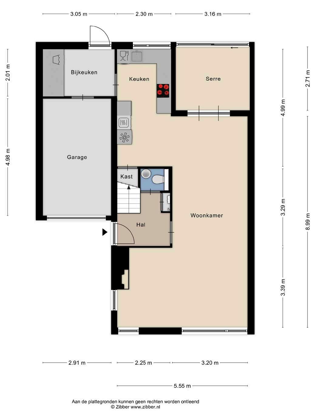Via de hal met meterkast, passeren we het toilet met fonteintje en de trapopgang naar boven en maken we een entree naar de woonkamer.