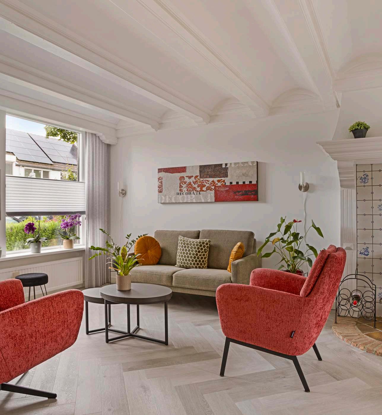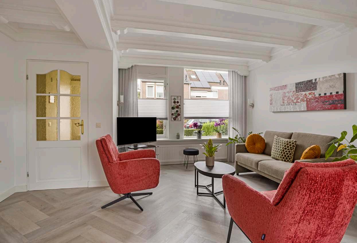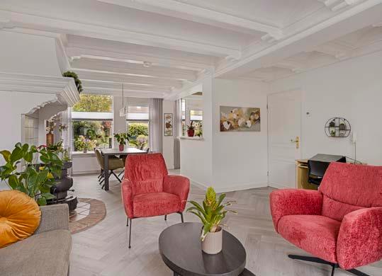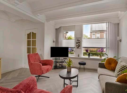 De sfeervolle woonkamer, voorzien van glad gestuukte wanden en een warme visgraat pvc vloer, heeft een praktische bergkast onder de trap en een sfeervolle gashaard, perfect voor knusse avonden.
