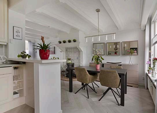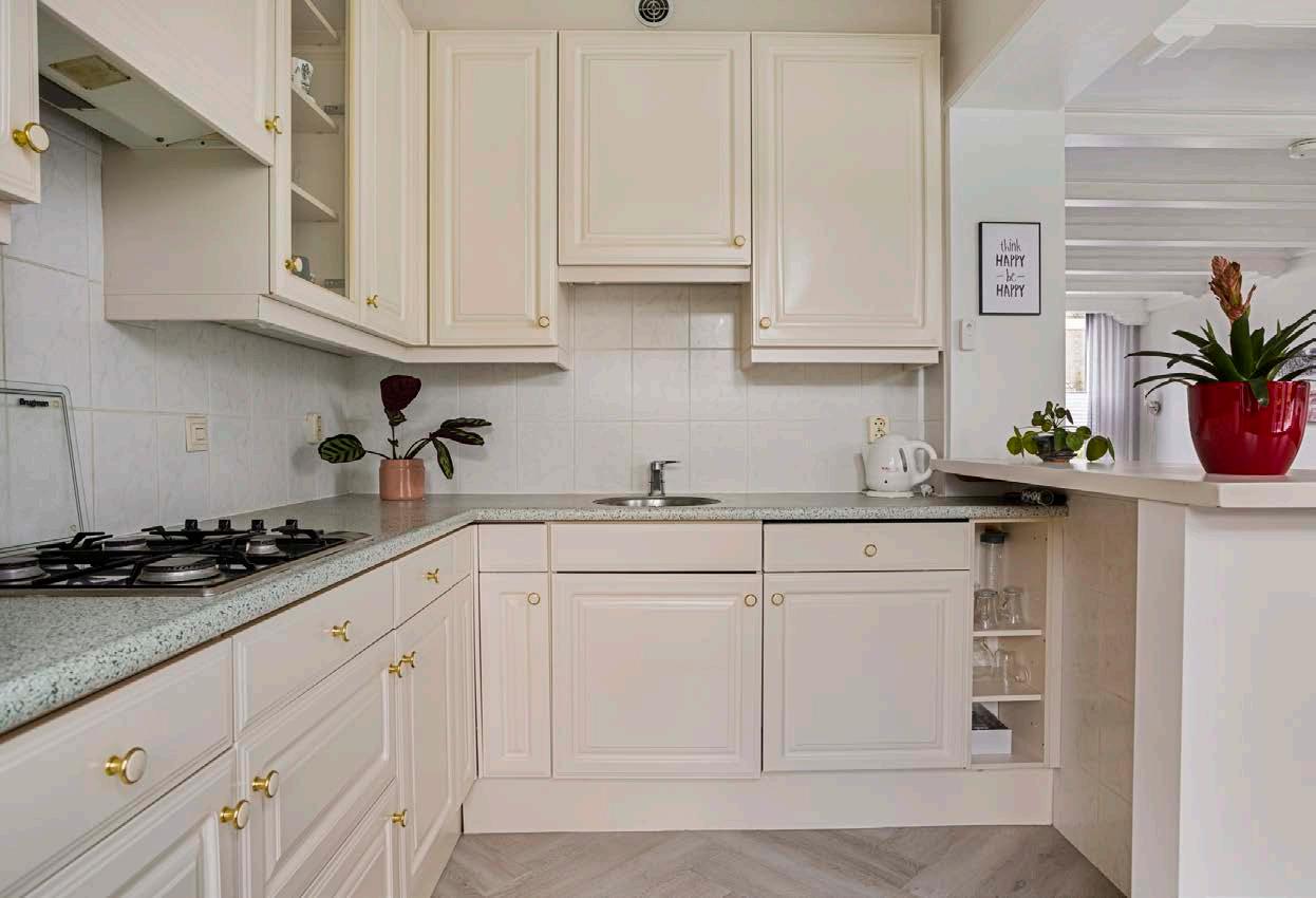 De semi open keukenruimte heeft een L-vormige keukenopstelling en is uitgerust met alle benodigde apparatuur; een koelkast, 4-pits gaskookplaat, afzuigkap, combi magnetron/oven en vaatwasser. Bovendien biedt de keuken voldoende kastruimte voor al je keukenbenodigdheden.
