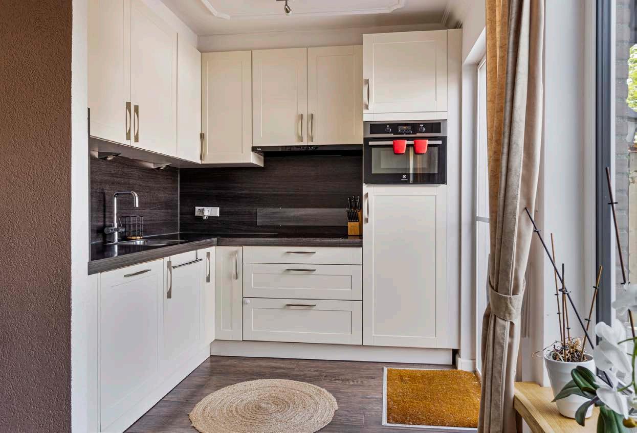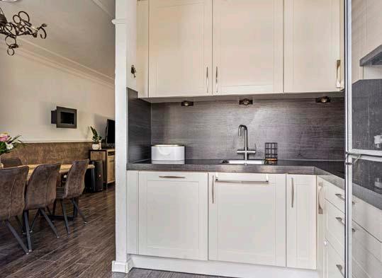 De aangrenzende open keuken aan de achterzijde nodigt uit tot koken en samenzijn, met moderne apparatuur en voldoende kastruimte.