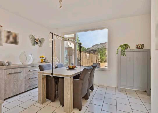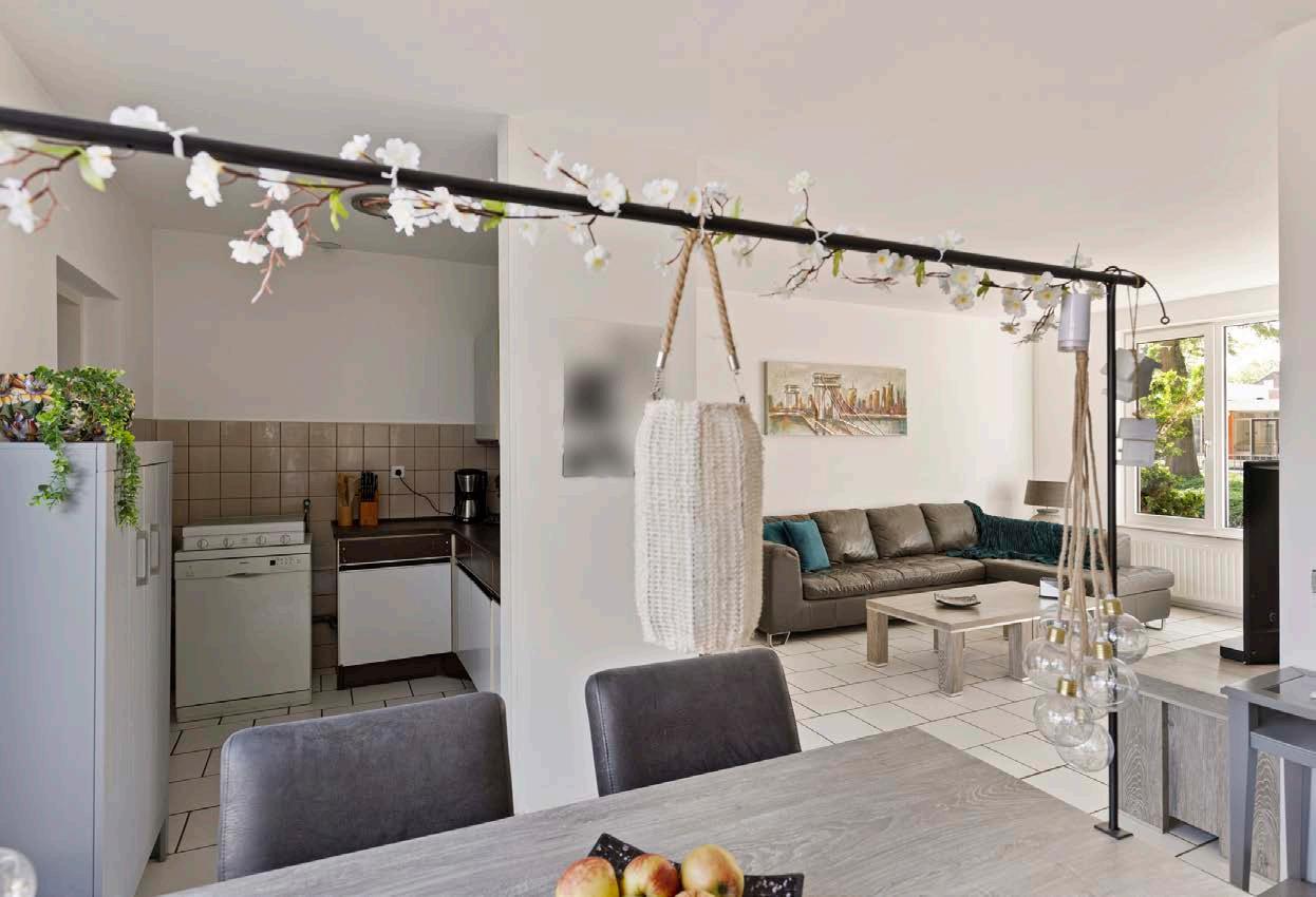 De ruime, lichte woonkamer vormt het hart van dit huis, gevuld met zonlicht door de grote ramen. Hier voel je je direct thuis.
