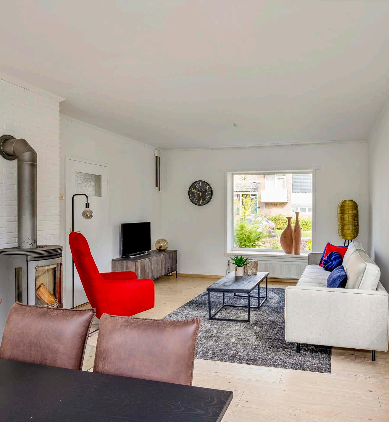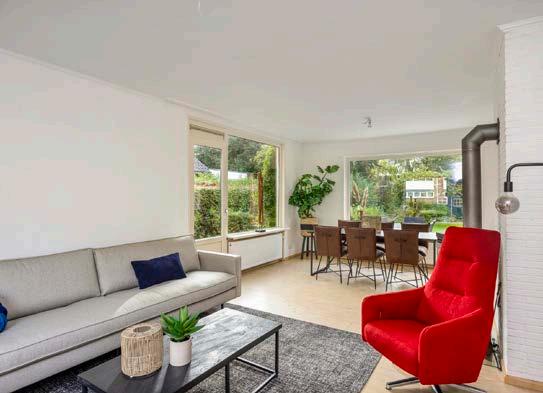 De prachtige woonkamer is voorzien van een gezellige haard en heeft voldoende ruimte voor zowel een zit- als eethoek. De keurige afwerking geeft deze ruimte een smaakvolle uitstraling die direct uitnodigt om te ontspannen en te genieten. Met grote ramen die overvloedig natuurlijk licht binnenlaten, is deze woonkamer de perfecte plek om te genieten van een warme en gastvrije sfeer.