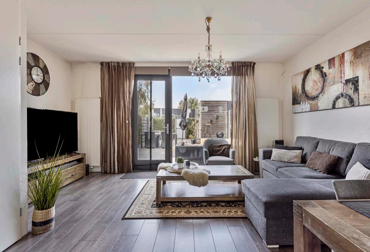 De lichte woonkamer heeft grote ramen die uitkijken op de groene omgeving, wat zorgt voor een prettige sfeer.