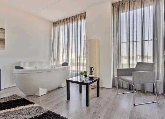 Een ander uniek kenmerk van deze woning is de extra woonlaag, die we volledig als slaapkamer hebben ingericht met een eigen vrijstaande jacuzzi. Hier kunnen we na een lange werkdag volledig