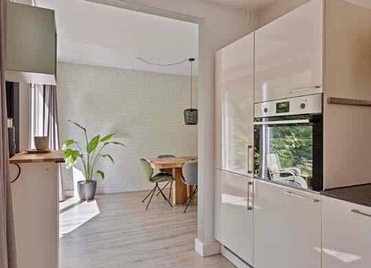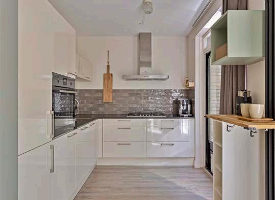 De moderne keuken is van alle gemakken voorzien en biedt ruim voldoende kastruimte. Hier kun je koken terwijl je uitkijkt op de zonnige achtertuin.