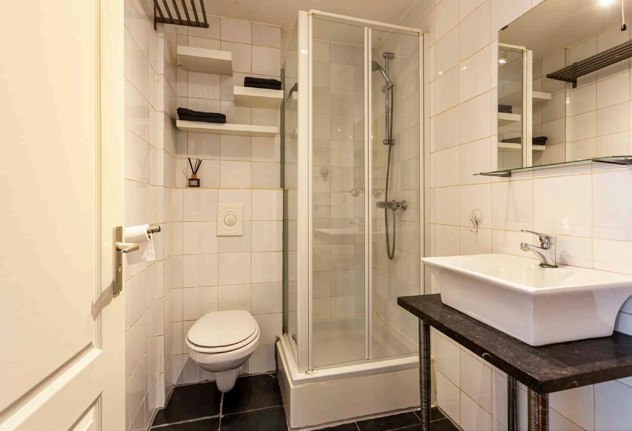 Tussen de woonkamer en de keuken is de badkamer. Deze is geheel betegeld en heeft een verzorgde uitstraling. In de badkamer ben je voorzien van een wastafel, toilet en douchecabine.
